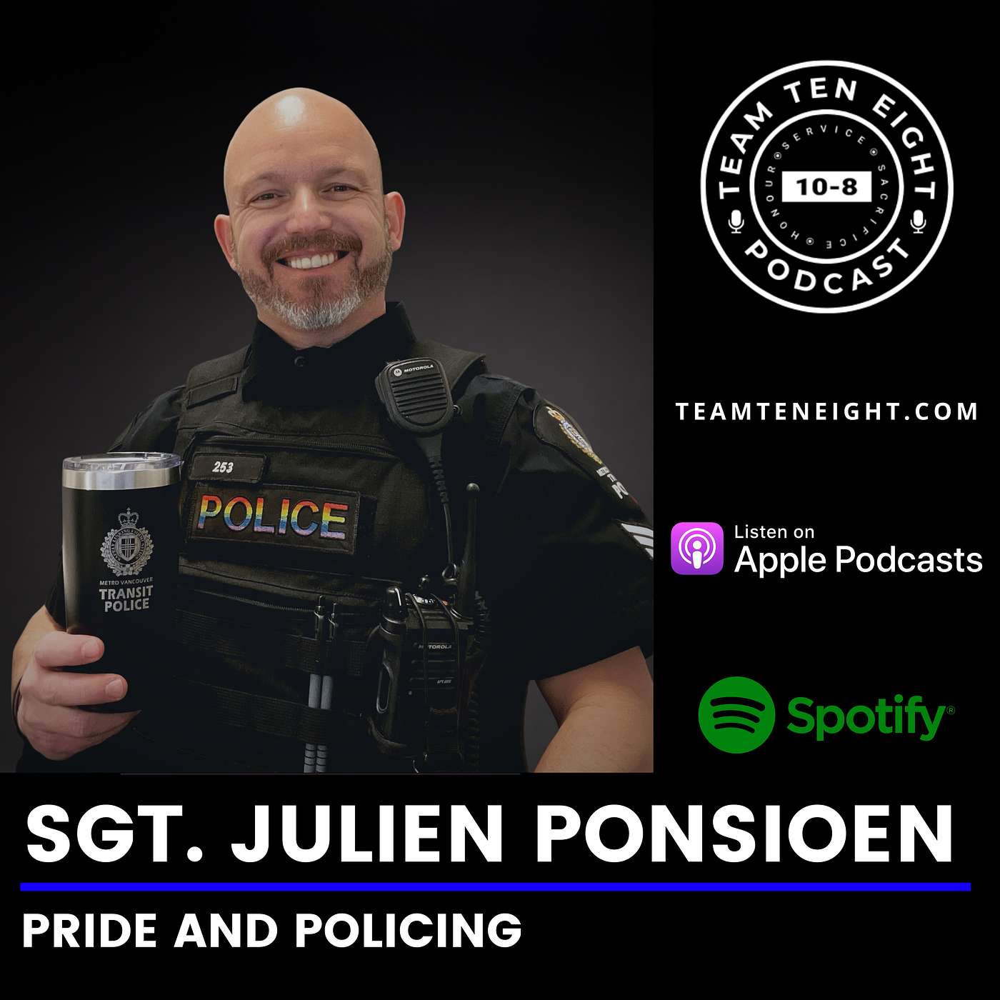 Sergeant Julien Ponsioen began his policing career with the Metro Vancouver Transit Police in 2014 after a 21 year career as a Paramedic and Supervisor and was the first openly gay male police officer hired by his department and the only openly gay male in his police academy class.