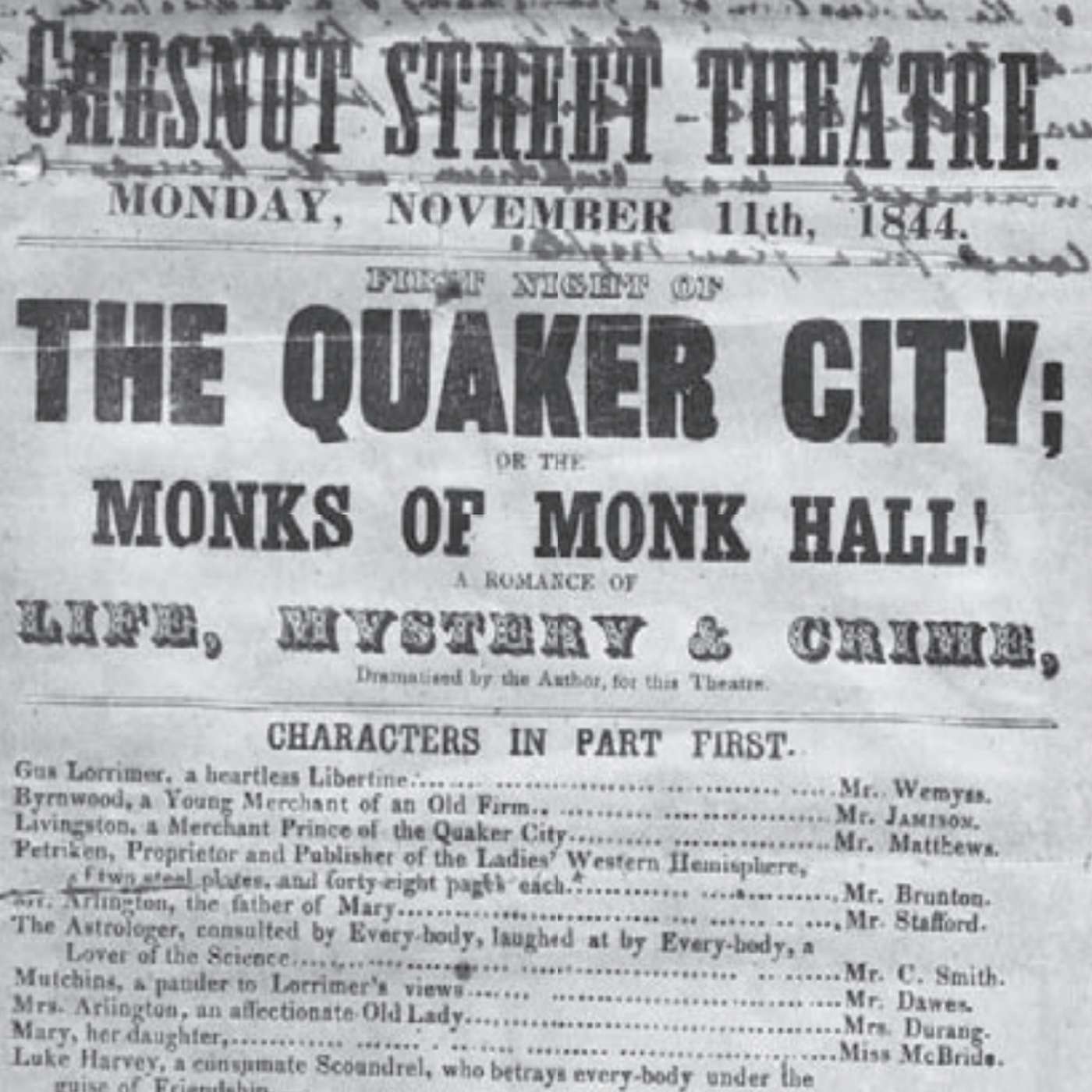The mob is gathering in the street outside the Chestnut Street Theatre, while inside the rehearsals for the scandalous play The Quaker City go on! The thrilling conclusion of our three part series! Will it all end in a deadly riot? The suspense is building . . .