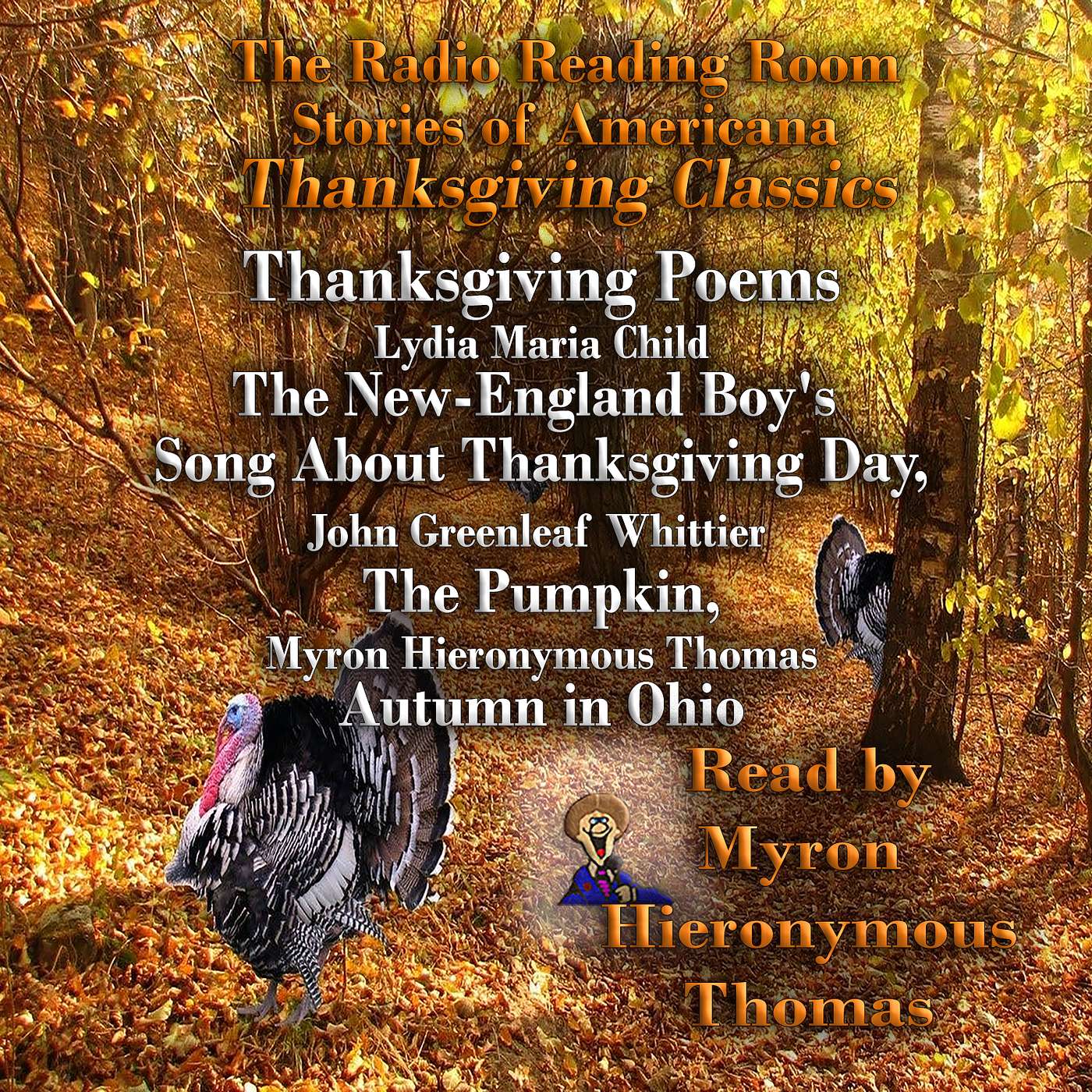 In this episode, we'll share some Thanksgiving poems. beginning with one you might recognize from the song, but by a different name. It's called The New England Boys' Song About Thanksgiving Day and was written by Lydia Maria Child. Our next poem is called The Pumpkin, and it's by John Greenleaf Whittier, who lived from 1807 to 1892. and the last is a poem by Myron Hieronymous Thomas, called Autumn in Ohio. All read by Myron Hieronymous Thomas.