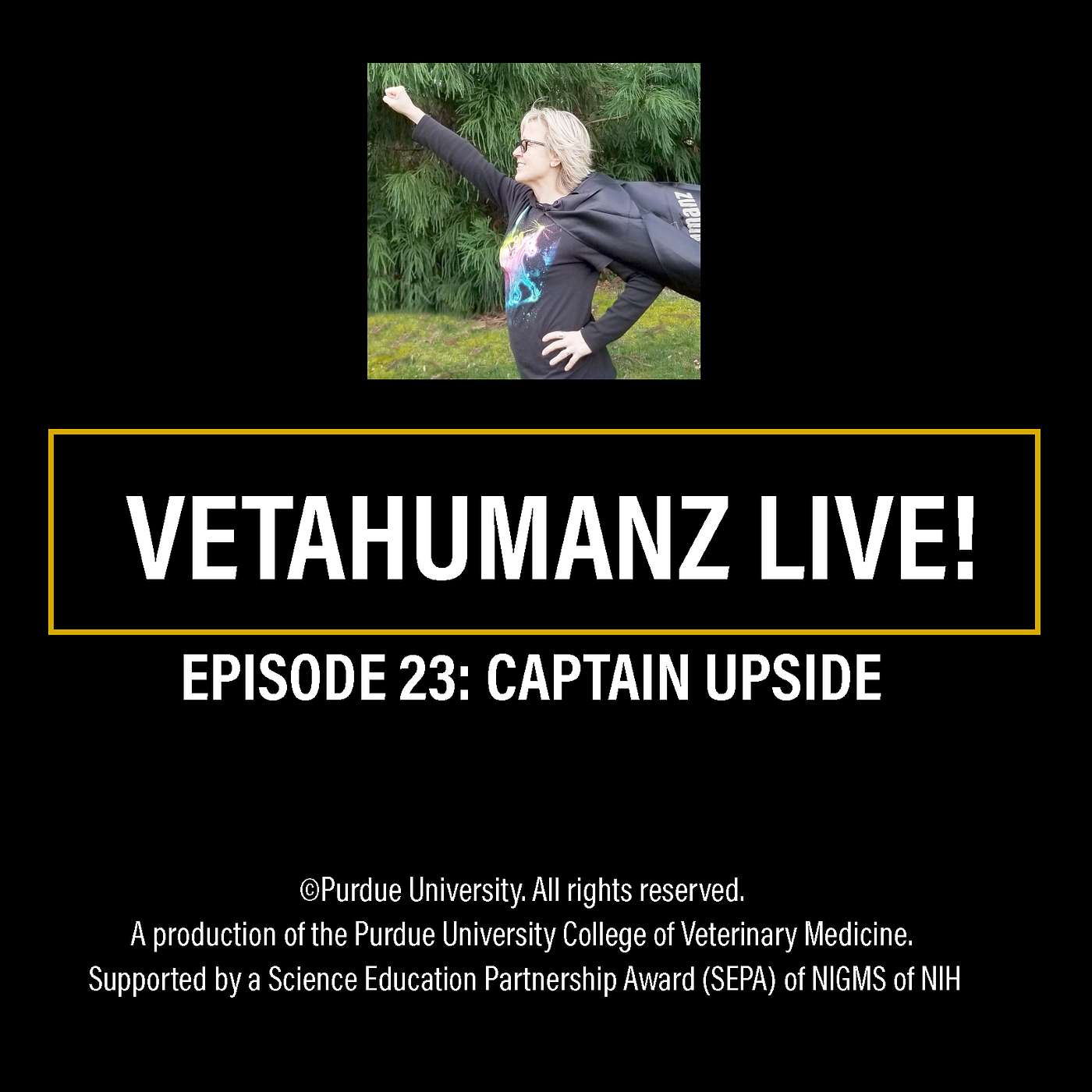 Thanks for listening to VetaHumanz Live! If you enjoyed this episode, be sure to subscribe, rate, and share this podcast with your friends on social media. VetaHumanz Live! is a production of the Purdue University College of Veterinary Medicine and is supported by the Science and Education Partnership Award (SEPA) program of the NIGMS of the NIH. Be sure to visit us at www.VetaHumanz.org! Thank you and Use Your Powers For Good!