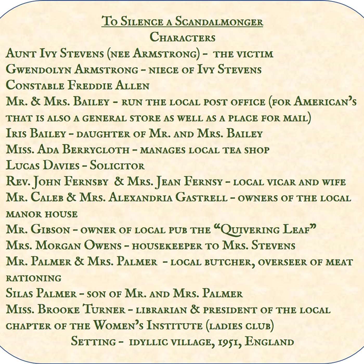 This is the thirteenth letter in the murder mystery series. Come get the latest on this cozy whodunit. Test your skills as you assume the role of one Gwen Armstrong, student in Oxford, England. Your post is full of regular letters from your Aunt Ivy and other residents of the village of Upper Stock Green. Hidden in that peaceful quiet village is a murderer, see if you can solve the crime before the last letter arrives.
