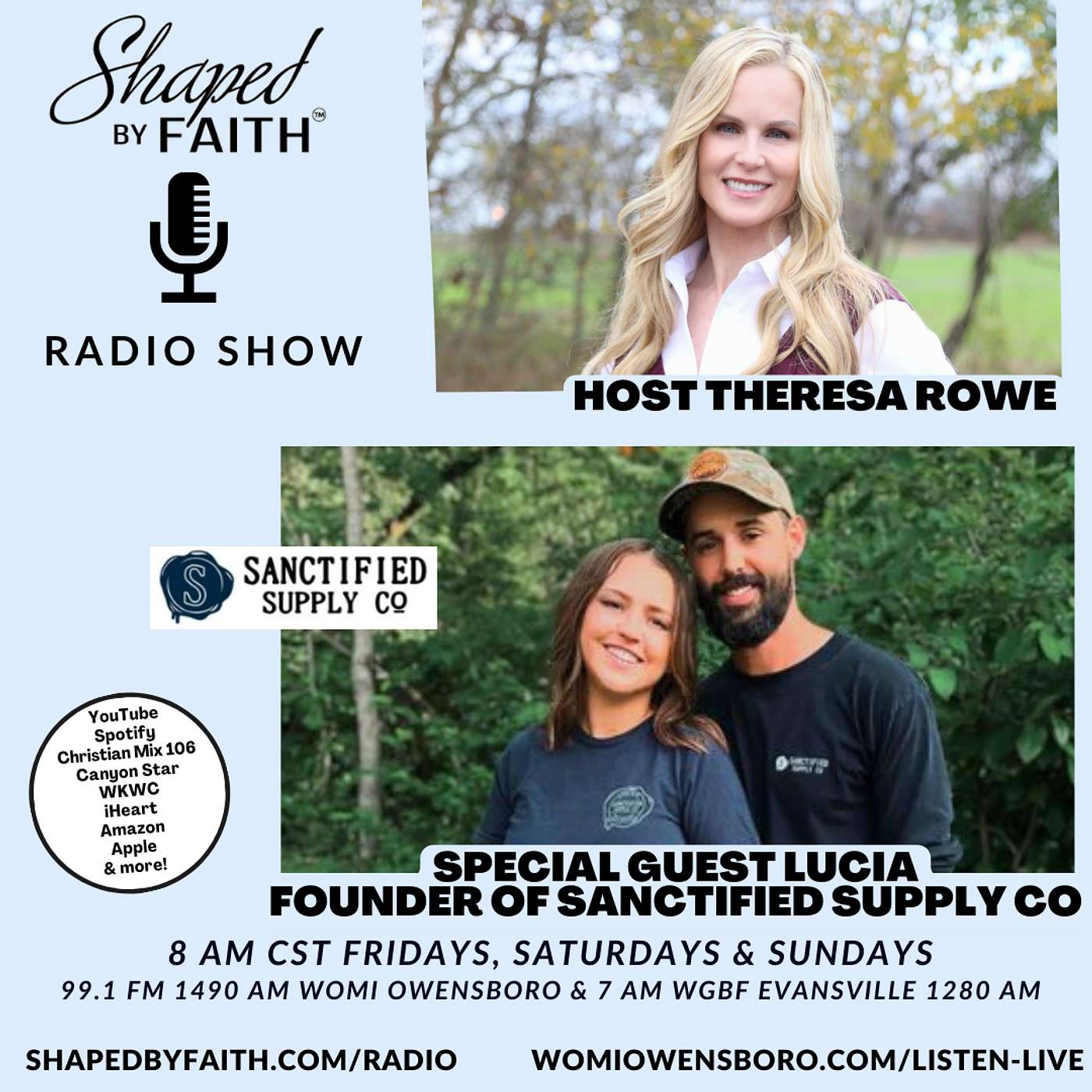 Listen Live to Shaped by Faith with Theresa Rowe on Fridays, Saturdays and Sundays at 8 AM CST on 99.1 FM WOMI Owensboro 1490 AM.