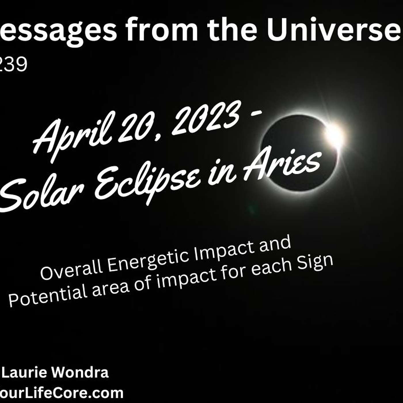 Eclipses are dramatic "wild cards" and can bring changes or events that we don't see coming. They can help you do things you never thought you could do, overcome fears, and show yes, you CAN do it! Take note of all news and signals you get near eclipses. Listen as Laurie gives and overview of the Aries Solar Eclipse and the potential areas of impacts for each sign.
