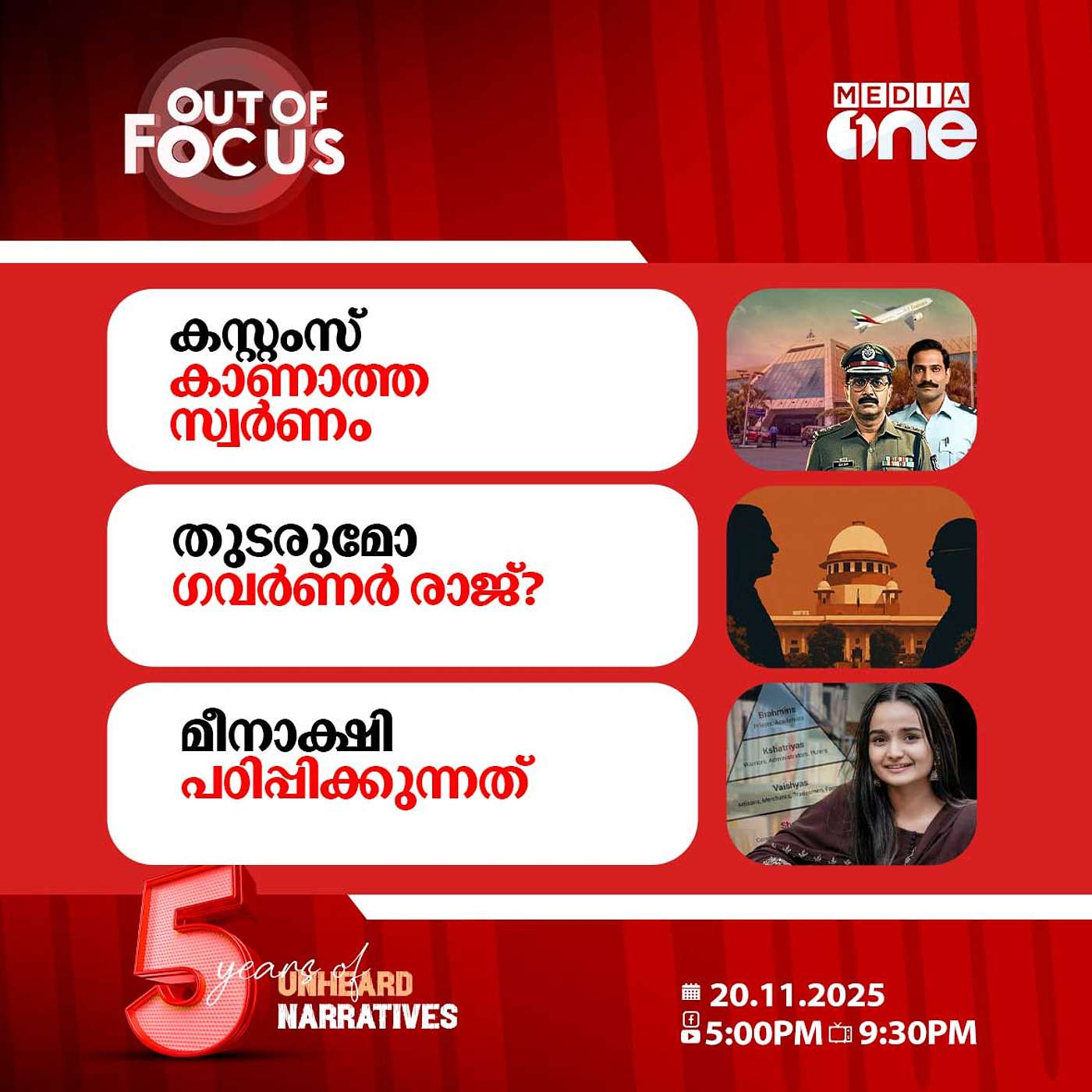1. കസ്റ്റംസ് കാണാത്ത സ്വർണം2. തുടരുമോ ഗവർണർ രാജ്? 3. മീനാക്ഷി പഠിപ്പിക്കുന്നത്