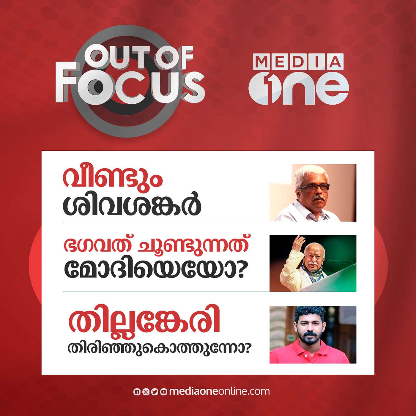 Out Of Focus 15-02-20231. വീണ്ടും ശിവശങ്കർ2. ഭഗവത് ചൂണ്ടുന്നത്മോദിയെയോ?3. തില്ലങ്കേരിതിരിഞ്ഞുകൊത്തുന്നോ?Panel - S A Ajims, Smruthi Paruthikkad, Nishad Rawther