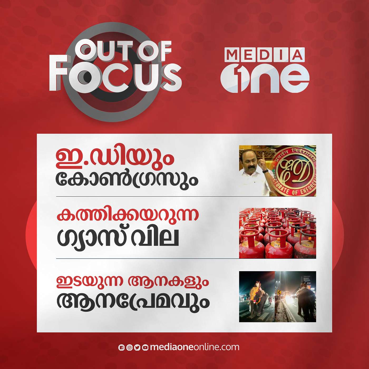 Out Of Focus 01- 03 - 20231. ഇ.ഡിയും കോൺഗ്രസും2. കത്തിക്കയറുന്ന ഗ്യാസ് വില3. ഇടയുന്ന ആനകളും ആനപ്രേമവുംPanel - C Davood, S A Ajims, Nishad Rawther