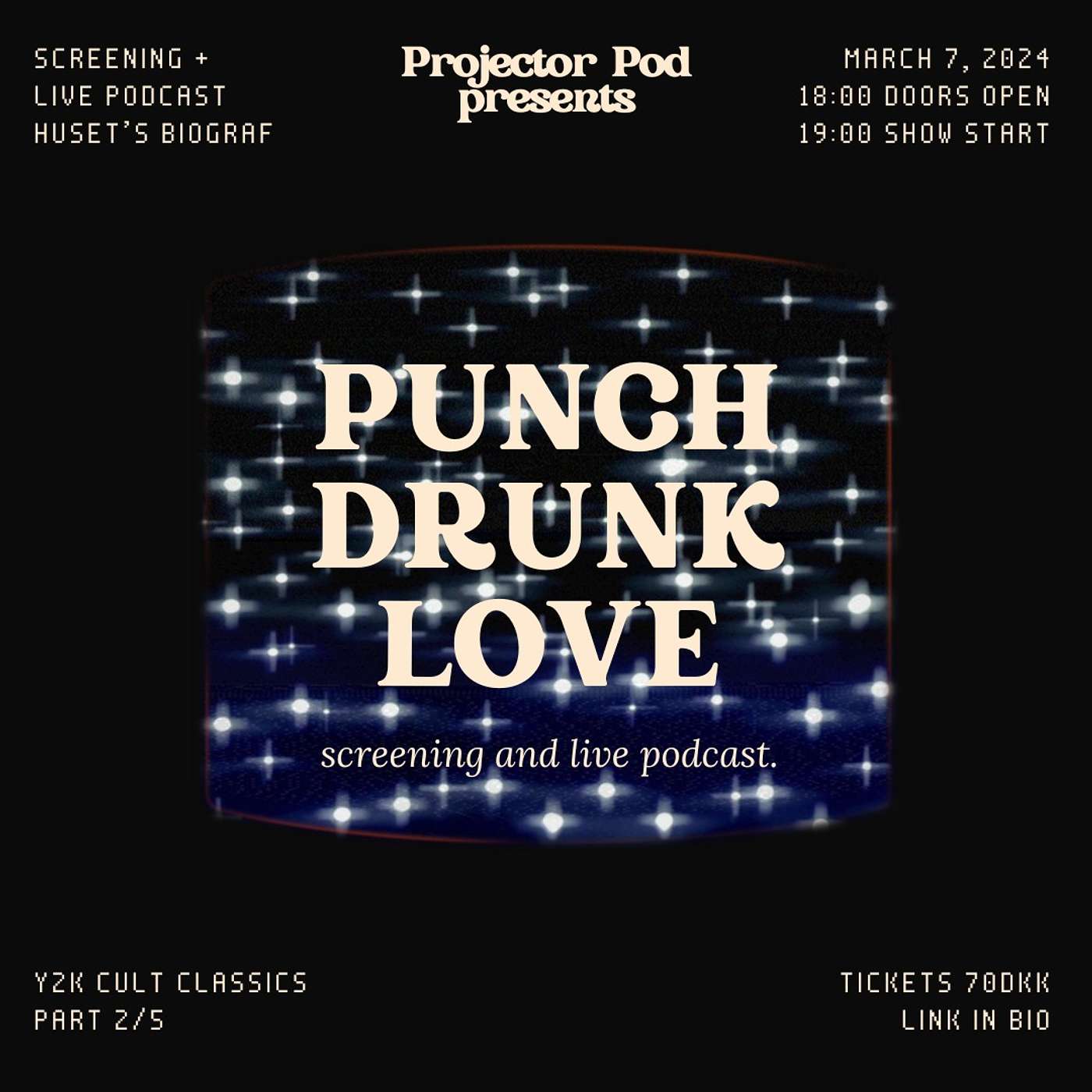 Projector pod presents at Huset Biograf returns with Paul Thomas Anderson's reinvention of the genre of the Adam Sandler romantic comedy, "Punch-Drunk Love". This film is a musical without musical numbers. Rife with the symbolism of fantasy it is a fable of how love can redeem us from our self-loathing, or maybe that is just a dream.