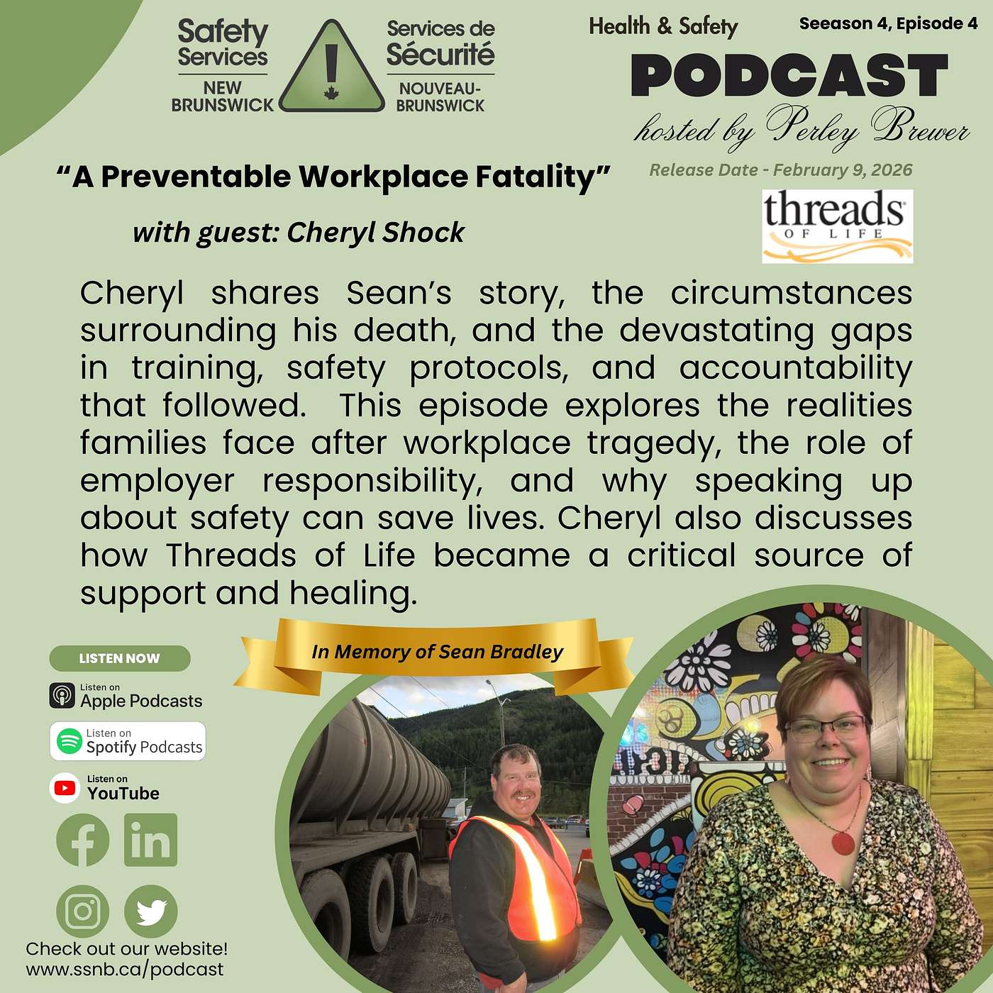 Cheryl shares Sean’s story, the circumstances surrounding his death, and the devastating gaps in training, safety protocols, and accountability that followed. This episode explores the realities families face after workplace tragedy, the role of employer responsibility, and why speaking up about safety can save lives. Cheryl also discusses how Threads of Life became a critical source of support and healing.
