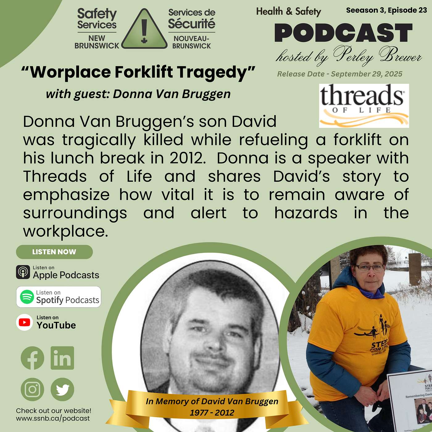 Donna Van Bruggen’s son David was tragically killed while refueling a forklift on his lunch break in 2012. Donna is a speaker with Threads of Life and shares David’s story to emphasize how vital it is to remain aware of surroundings and alert to hazards in the workplace.