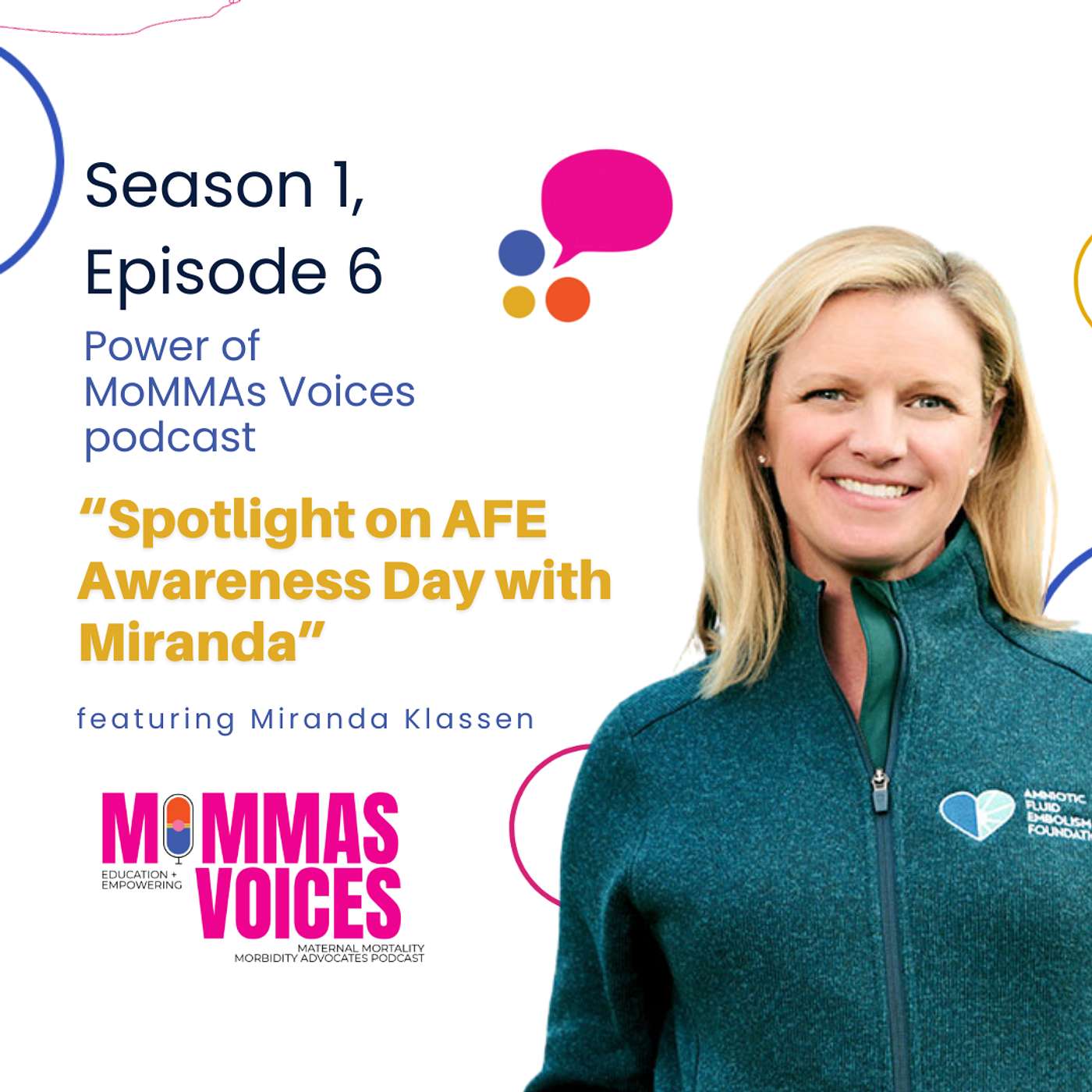 In this episode of Power of MoMMAs Voices, we have a special episode to commemorate Amniotic Fluid Embolism Awareness Day. Nicole Purnell interviews Miranda Klassen, an AFE survivor and the founder and executive director of the Amniotic Fluid Embolism (AFE) Foundation. Her passion for raising awareness of AFE was created from her own experience, which she shares in this podcast. She also explains the mission of the AFE Foundation and some of the life-changing programs that the foundation is involved with including, education, research, the AFE registry (which is the largest in the world), and support groups. “We do a lot of things to support our community. They're so very special to us,” said Miranda. Miranda also discusses meaningful volunteerism and the role that MoMMAs Voices plays. The conversation concludes with a discussion of AFE Awareness Day and the tradition of lighting a candle on March 27th.