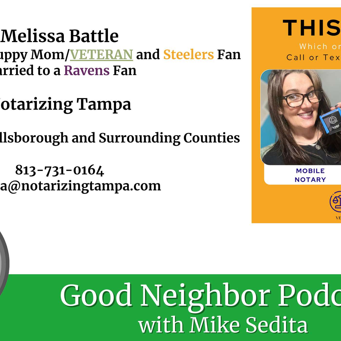 My name is Melissa Battle, I am the Owner and Founder of Notarizing Tampa Bay, LLC doing business as Notarizing Tampa. We are your a Mobile Notary and Wedding Officiant business located in Wesley Chapel, Florida. I am licensed, bonded, insured and fully background checked.