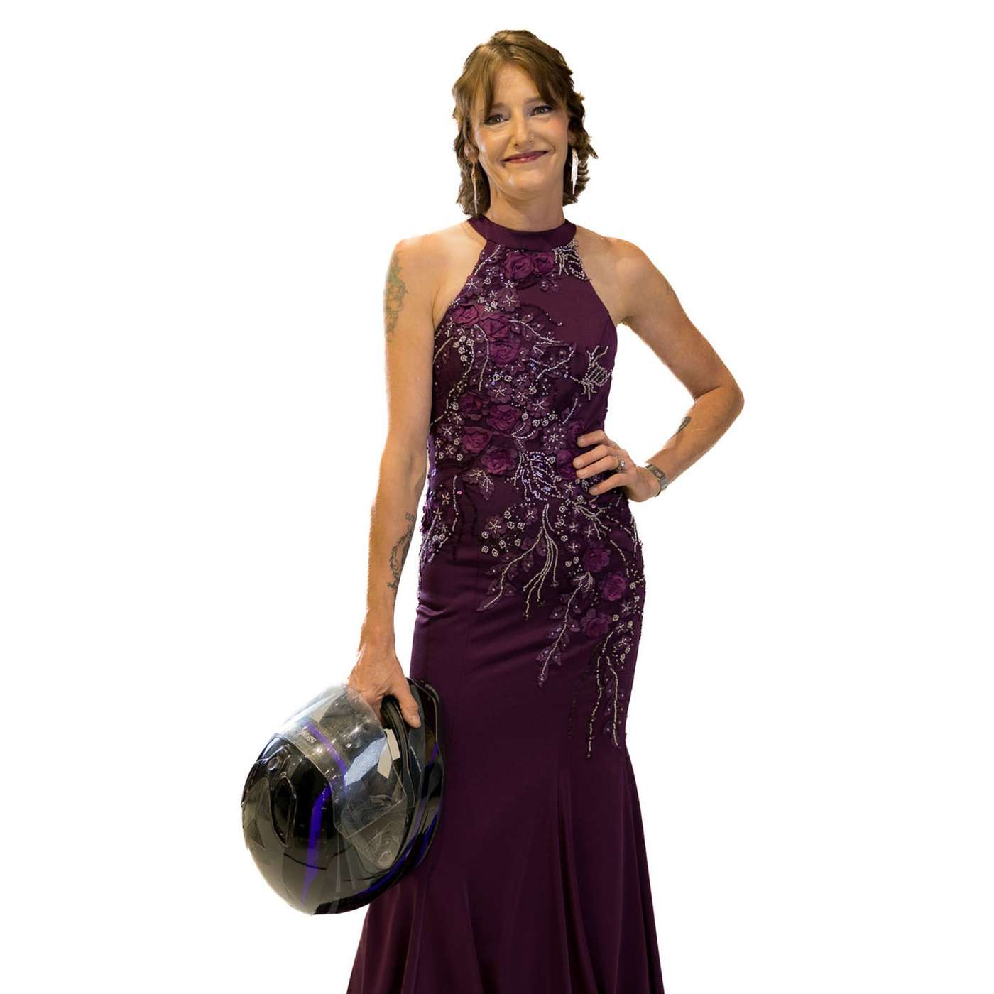 When we did her photo shoot, Louise asked if she could hold her motorcycle helmet while wearing her gown. I said, “Heck yeah!” It turned out to be the perfect shot—showing both sides of who she is: the fearless fighter and the elegant, feminine spirit within.
