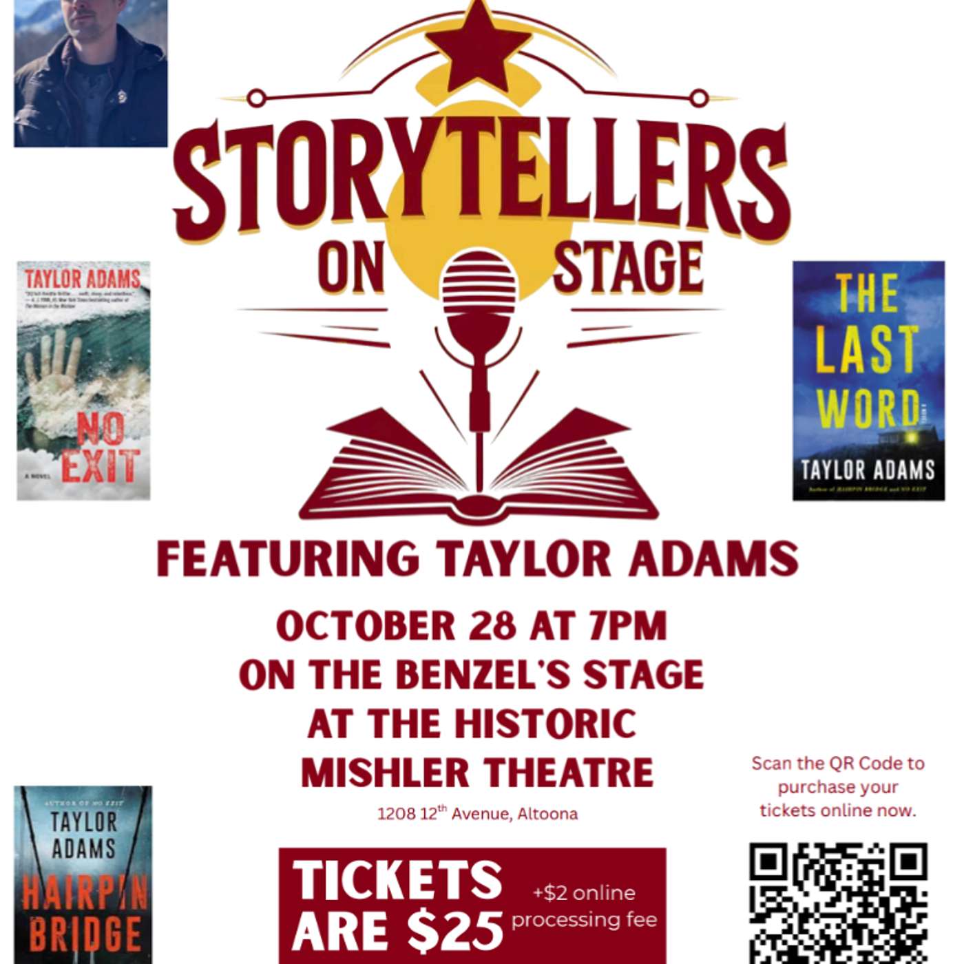 The event is called Storytellers On Stage and it features author Taylor Adams. Adams is the author of The Last Word, Our Last Night, and Eyeshot. His book, No Exit, has been adapted for a new movie on Hulu this February.