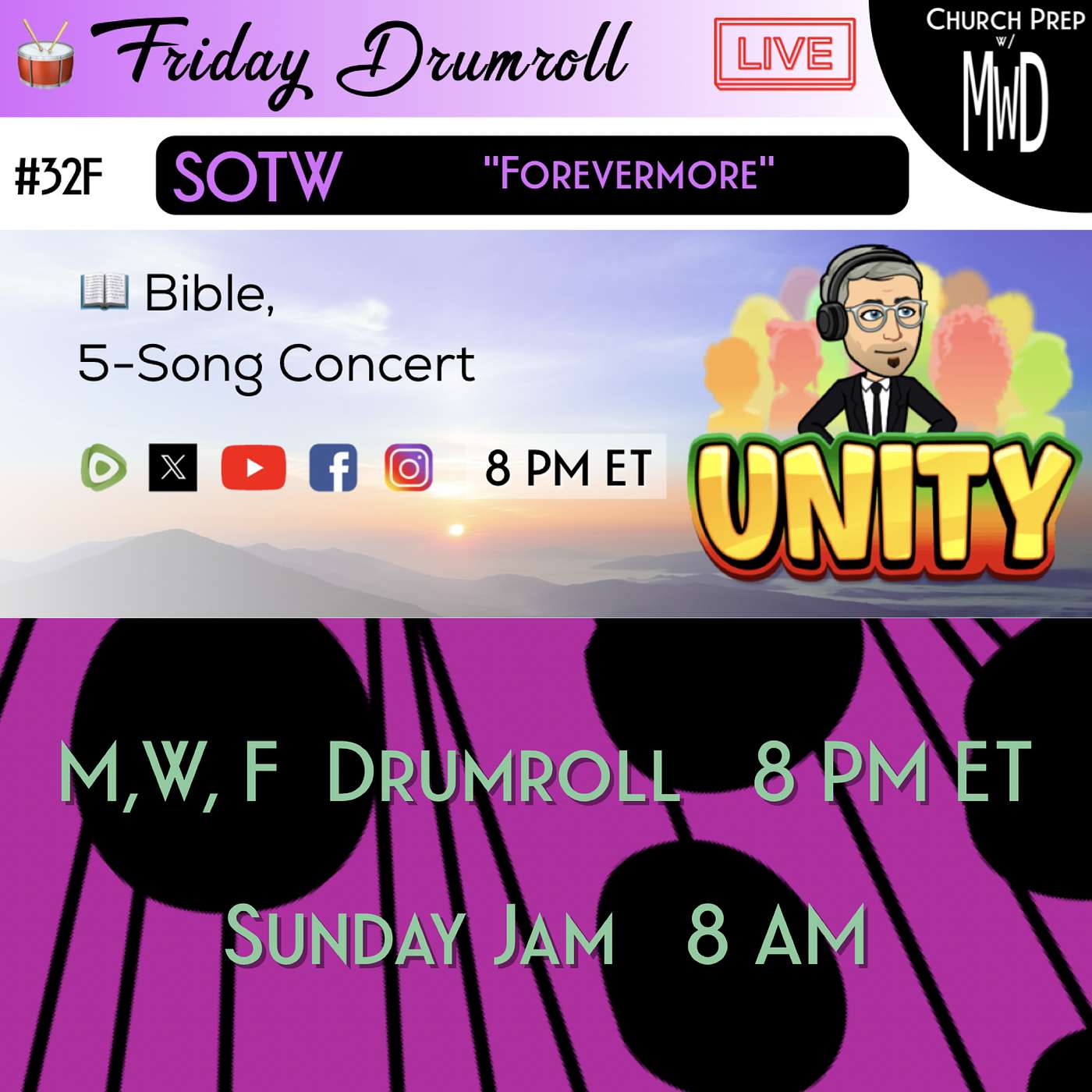 LIVE Drumroll happens right here every Monday, Wednesday, and Friday, at 8 PM Eastern. Monday’s Drumroll, introduces the Song of the Week's title and lyrics. Wednesday will feature the song's backstory, and Friday covers its scripture references. I'll finally release the Song of the Week during Sunday Jam as the 15th song, ending the, 8-9 AM, "getting ready for church, Church Prep" concert. The Monday, Wednesday, Friday shows include playing 5 of the 15 songs from the previous week. Please keep track of your favorite songs. I'm releasing 120 songs in a 3-year window. Free-Download the mp3 demos and lyric sheets at mwdhq.com. LIVE Weekday Drumroll shows are interactive with the audience. Sunday Jam will have no chit-chat, simply, solemn Church Prep.