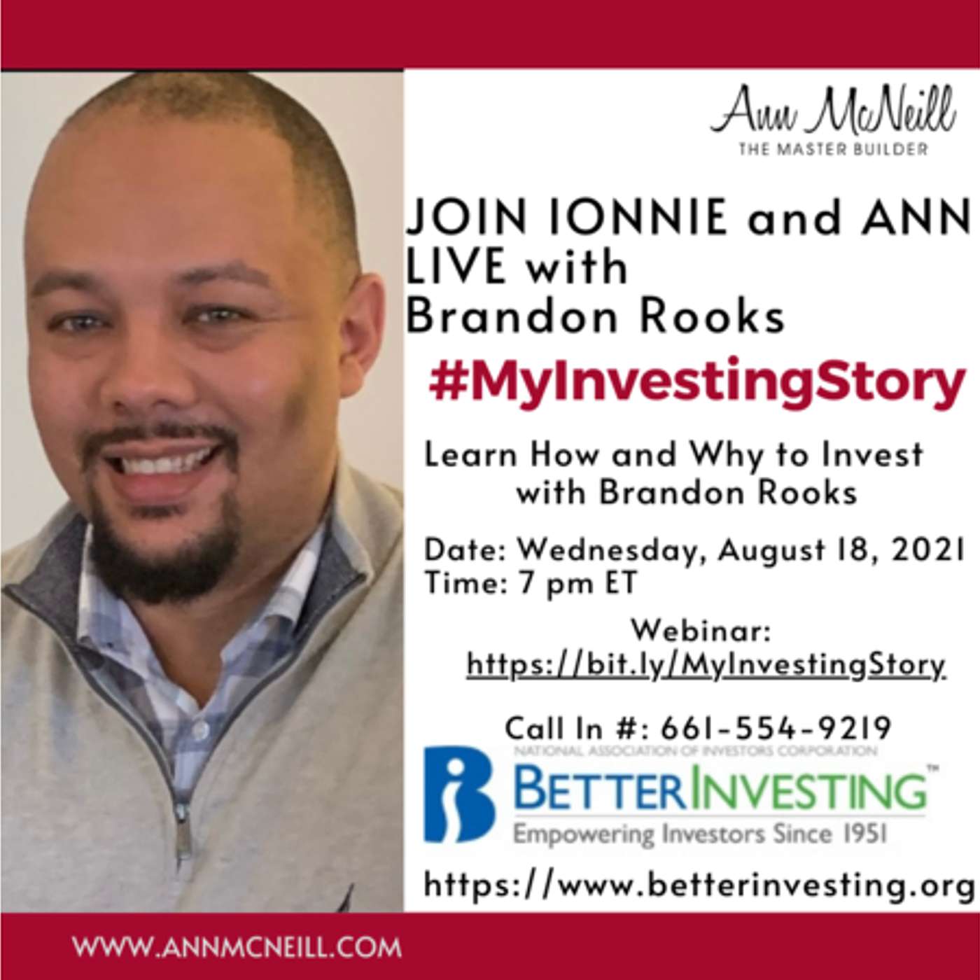#MyInvestingStory is created to share the stories of investors.Ionnie McNeill and Ann McNeill, BetterInvesting Volunteers, talk with Brandon Rooks about his investing story.To join the conversation:Register for the webinar: https://bit.ly/MyInvestingStoryListen to the podcast: http://tobtr.com/11986652Or call in: 661-554-9219Brandon Rooks is 37 years old, and resides in North Carolina, by way of Washington DC. He is an experienced IT and Cybersecurity professional who enjoys helping people build cool things "in the cloud".Brandon first learned how to invest from his father Brian and increased his focus when he himself became a dad. Along with his mentor (Warren Mickens), he founded "Better Investment Analysis" - an investment club that meets regularly to discuss building wealth in the stock market via long-term investing principles. The club has grown to include members from across the US, with a range of experience in various industries and disciplines.Brandon also volunteers in his community to create STEM learning opportunities for the next generation. In his free time, he enjoys sports, music, chess, traveling, and most of all spending time with his beautiful wife Kaleia and son Brandon Jr.