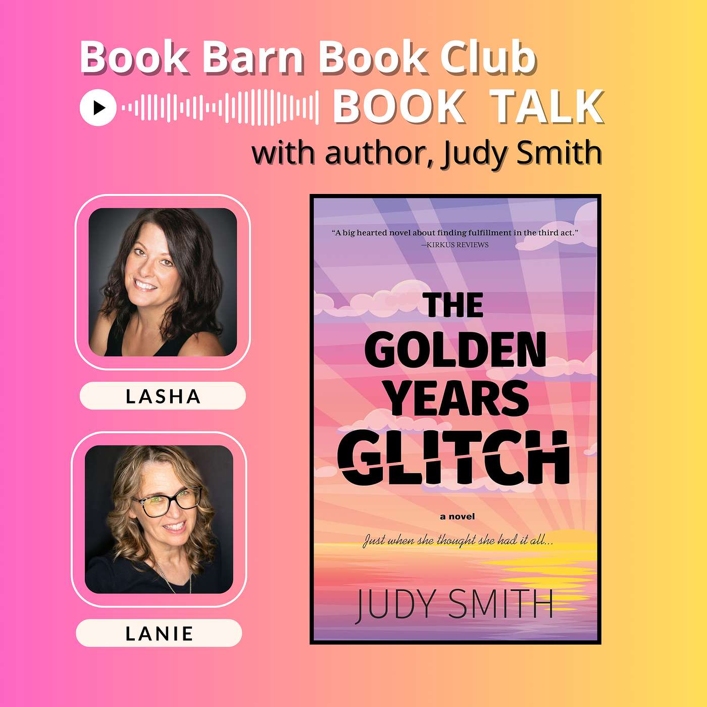 In this episode of the Book Barn Book Club Podcast, Lasha and Lanie have a fun and inspiring interview with author Judy Smith. She shares stories behind her writing and reflections that spark laughter and meaningful conversation. It’s the kind of episode that feels like pulling up a chair at book club with friends!