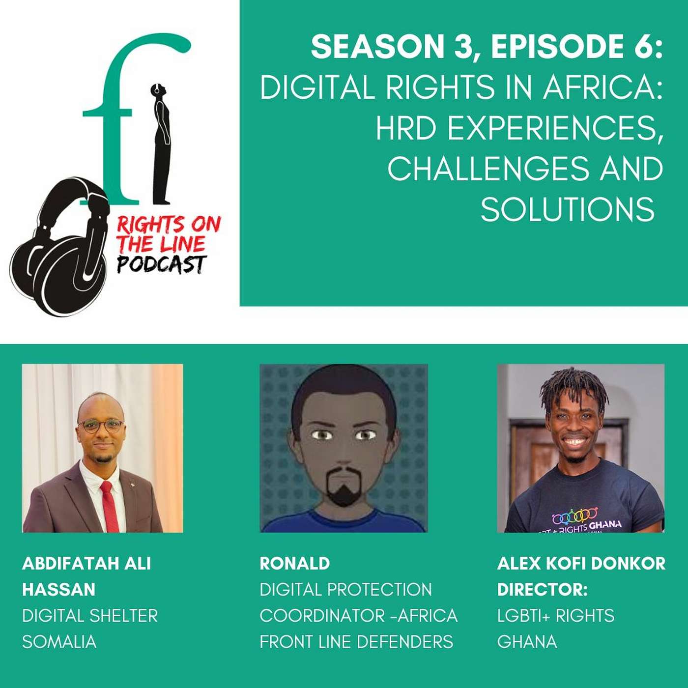In this episode, we talk about human rights defenders in Africa experiencing challenges in the digital space, on social media platforms and more. Ronald shares his insights as the Digital Protection Coordinator for the Africa region at Front Line Defenders, as well as very NB tips on how HRDs can protect themselves in the Digital space. Abdifatah, and HRD from Digital Shelter in Somalia, talks about a recently released report by Digital Shelter on how HRDs in Somalia and Africa are targeted digitally, as well as how it might be remedied. Alex talks about how LGBTI+ Rights Ghana was challenged when their social media accounts were shut down without warning in relation to their work, and how they went about dealing with that.
