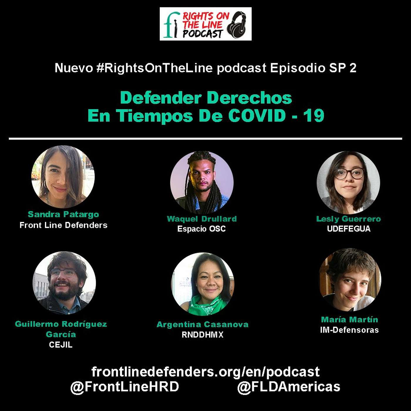 Episodio SP 2 - Defender Derechos En Tiempos De COVID - 19Una conversación con Sandra Patago, Front Line Defenders; Guillermo Rodríguez García. Oficial de incidencia del programa para México y centroamérica del Centro por la Justicia y el Derecho Internacional (CEJIL); Argentina Casanova, codirectora ejecutiva de la RNDDHMX; Waquel Drullard, facilitadore de proyectos en Artículo 19 en la oficina de Mx y Centroamérica y colabora en la facilitación del Espacio OSC en México; María Martín, coordinadora de incidencia de la IM-Defensoras; y Lesly Guerrero, encargada área legal internacional de UDEFEGUA (Guatemala).Además del fuerte impacto que ha tenido la crisis sanitaria generada por la pandemia de COVID-19 en el acceso a derechos y servicios básicos, esta ha resultado también en una profundización de la crisis democrática y de derechos humanos en la región mesoamericana. Como respuesta a la pandemia, algunos Estados de la región han implementado acciones de carácter punitivo, como toques de queda, estados de excepción o la militarización de la seguridad ciudadana, entre otras medidas contrarias a los derechos humanos de la población. En este contexto, la defensa de los derechos humanos enfrenta nuevos obstáculos y, a la vez, se vuelve más urgente que nunca.Estas son algunas de las conclusiones del brief “Defender derechos en tiempos de COVID-19: retos para México y Centroamérica” publicado el día de hoy por el Espacio OSC para la protección de personas defensoras y periodistas (Espacio OSC), Front Line Defenders, la Iniciativa Mesoamericana de Mujeres Defensoras de Derechos Humanos (IM-Defensoras), la Red Nacional de Mujeres Defensoras de Derechos Humanos en México (RNDDHM), el Centro por la Justicia y el Derecho Internacional (CEJIL), la Unidad de Protección a Defensoras y Defensores de Derechos Humanos, Guatemala (UDEFEGUA), el North American Congress on Latin America (NACLA), y Trade Unions for Energy Democracy (TUED).