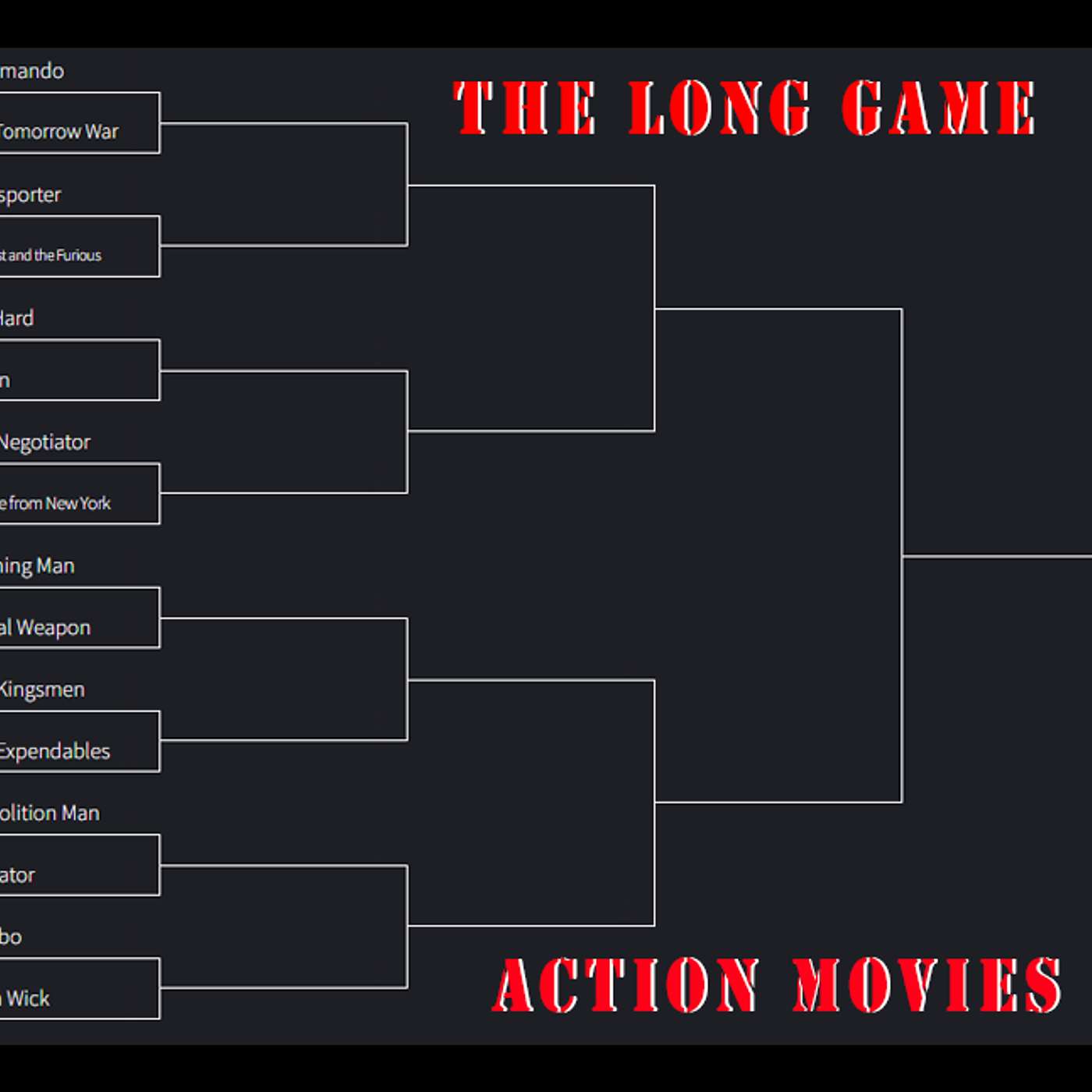 Welcome to the first episode of a new series... THE LONG GAME... In this episode of the THE LONG GAME they will pit 16 different action movies against each other in a single elimination bracket to see which action movie franchise is the best!