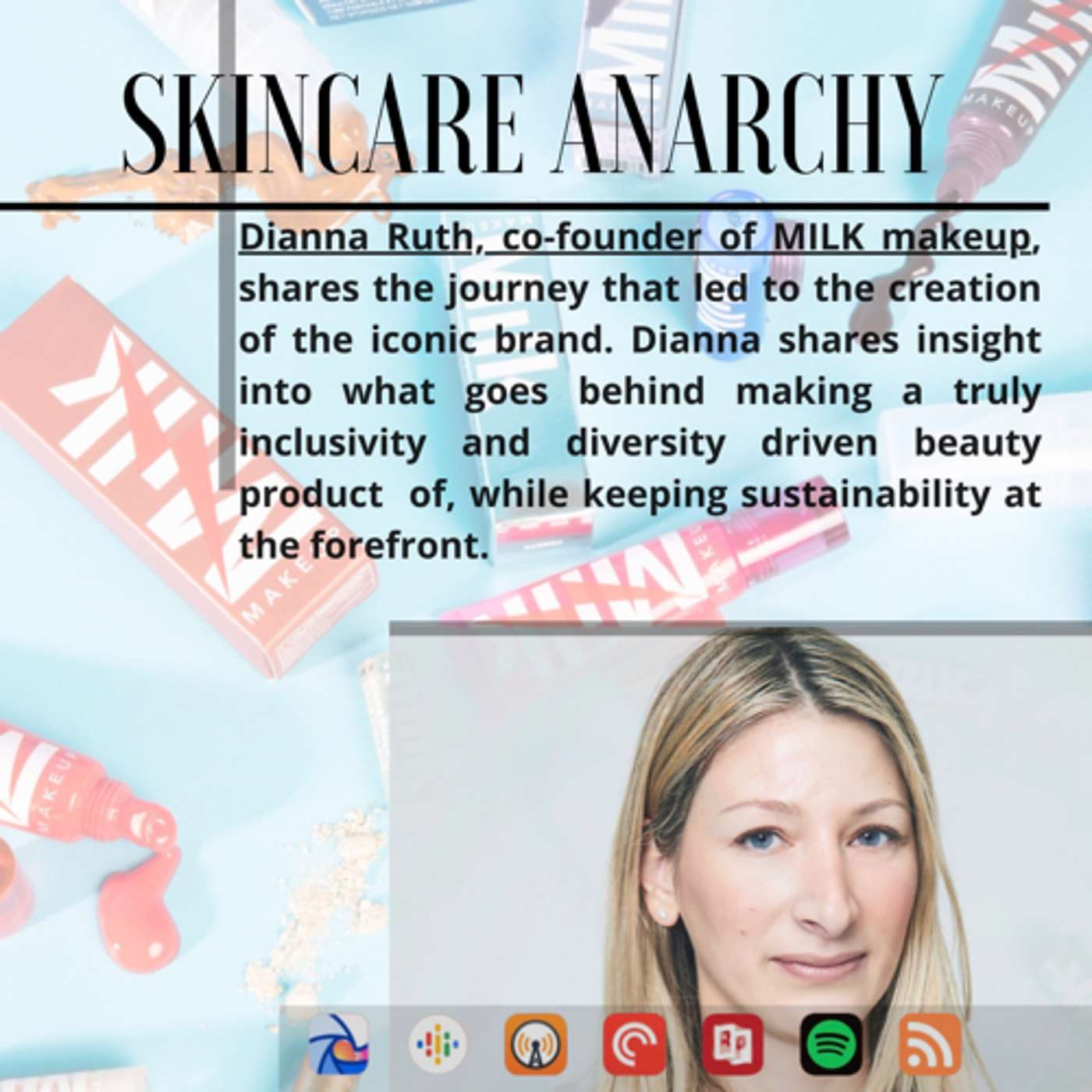 Dianna Ruth, co-founder of MILK makeup, shares the journey that led to the creation of the iconic brand. Dianna shares insight into what goes behind making a truly inclusivity and diversity driven beauty product of, while keeping sustainability at the forefront.--- Send in a voice message: https://podcasters.spotify.com/pod/show/skincareanarchy/messageSupport this podcast: