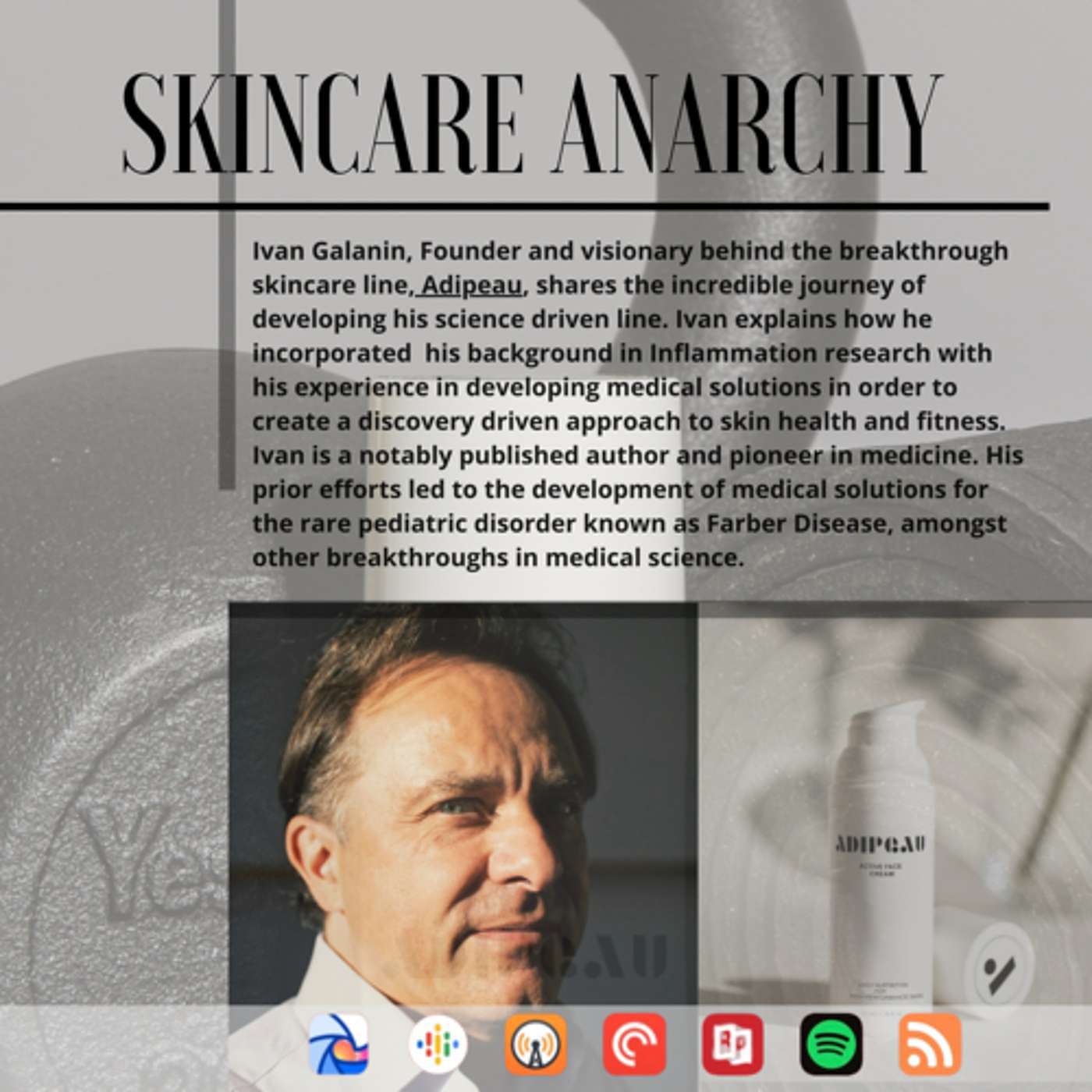 Ivan received his scientific training in inflammation research at sanofi. Before he started Adipeau, he founded two successful companies. Plexcera Therapeutics developed a treatment for a rare pediatric genetic disease (Farber Disease). When Ivan started Plexcera, there was only one living patient with Farber. He sold the company to a large public biotech company. After Plexcera, he started MyPersonalTherapeutics, which identified patient-specific drug combinations for colon cancer. The company built genetically complex fruit fly avatars representing individual human cancers and conducted massive clinical studies in the fruit flies. Both companies were spun out of Mount Sinai School of Medicine, where Ivan had worked as Director of Commercial Development. Ivan is now dedicated to researching how the remarkable regenerative powers of the skin can be harnessed to advance facial and whole body fitness. He was recently published in a notable peer reviewed journal, Aesthetic Plastic Surgery. He is also committed to increasing the level of scientific understanding amongst skincare consumers. --- Send in a voice message: https://podcasters.spotify.com/pod/show/skincareanarchy/messageSupport this podcast: