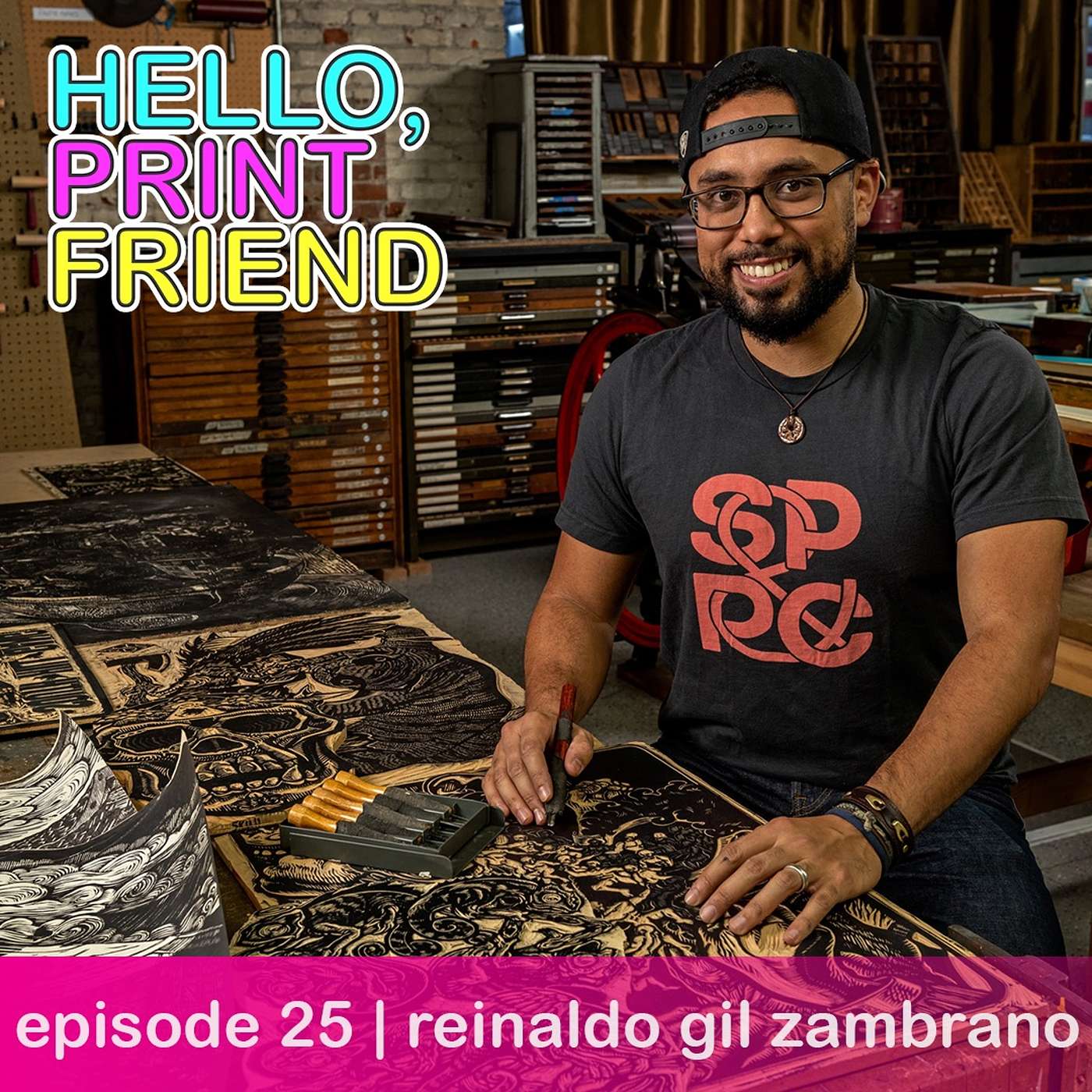 In this episode Miranda speaks with Reinaldo Gil Zambrano community builder, lecturer, printmaker, story teller, and printmaking advocate. We talk about his childhood growing up in Caracas, Venezuela; his leaving home at sixteen to study in Costa Rica; learning about illustration as visual communication; and finding a sense of home in a changing life through shared narratives. We also chat about magical realism in Latin American culture and some family legends from the artist’s childhood. We welcome Reinaldo as our second artist to feature a double release of the podcast episode, with one in Spanish and the other in English.[more information]Reinaldo Gil Zambrano Websitehttp://www.reinaldogilzambrano.com/RGZ Instagramhttps://www.instagram.com/rgzprints/Spokane Print & Publishing Centrehttps://www.facebook.com/spokaneprint/Taller TAGA in Caracashttps://www.instagram.com/tallertaga/Shop Talkwww.patreon.com/helloprintfriendYOUTUBEwww.youtube.com/channel/UCOMIT3guY5PjHj1M7GApouwMERCHwww.teepublic.com/user/helloprintfriendWEBSITEwww.helloprintfriend.cominstagramwww.instagram.com/helloprintfriendprint galleryhelloprintfriend.com/print-gallery✨patreon✨www.patreon.com/helloprintfriendOur sponsor Speedballwww.speedballart.com