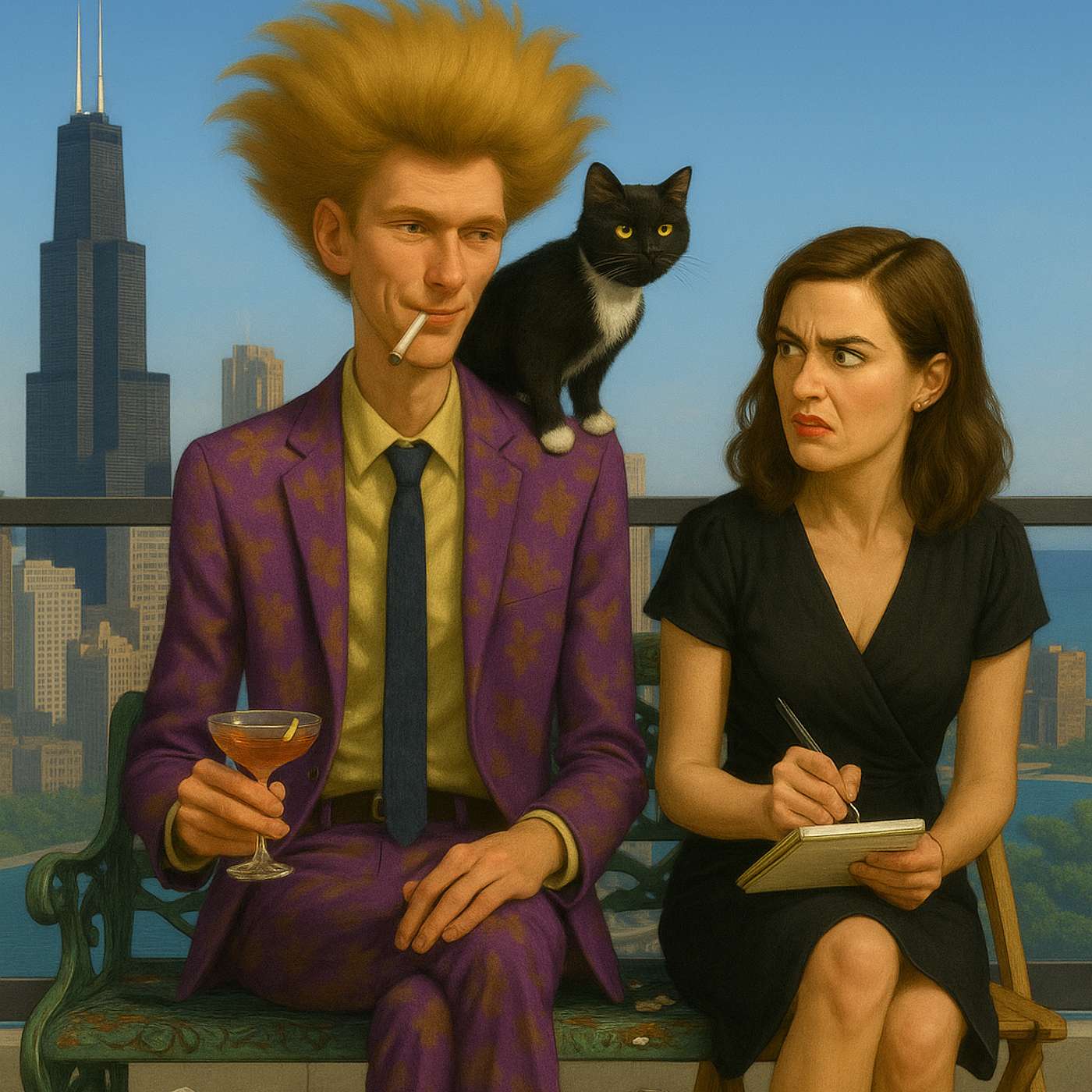 Their exchanges are a twisted dance of sneers, misunderstandings, and bizarre flirtations — set against a panoramic Chicago skyline that feels one stiff breeze away from swallowing them both, or hurling them into their own libidious oblivon.