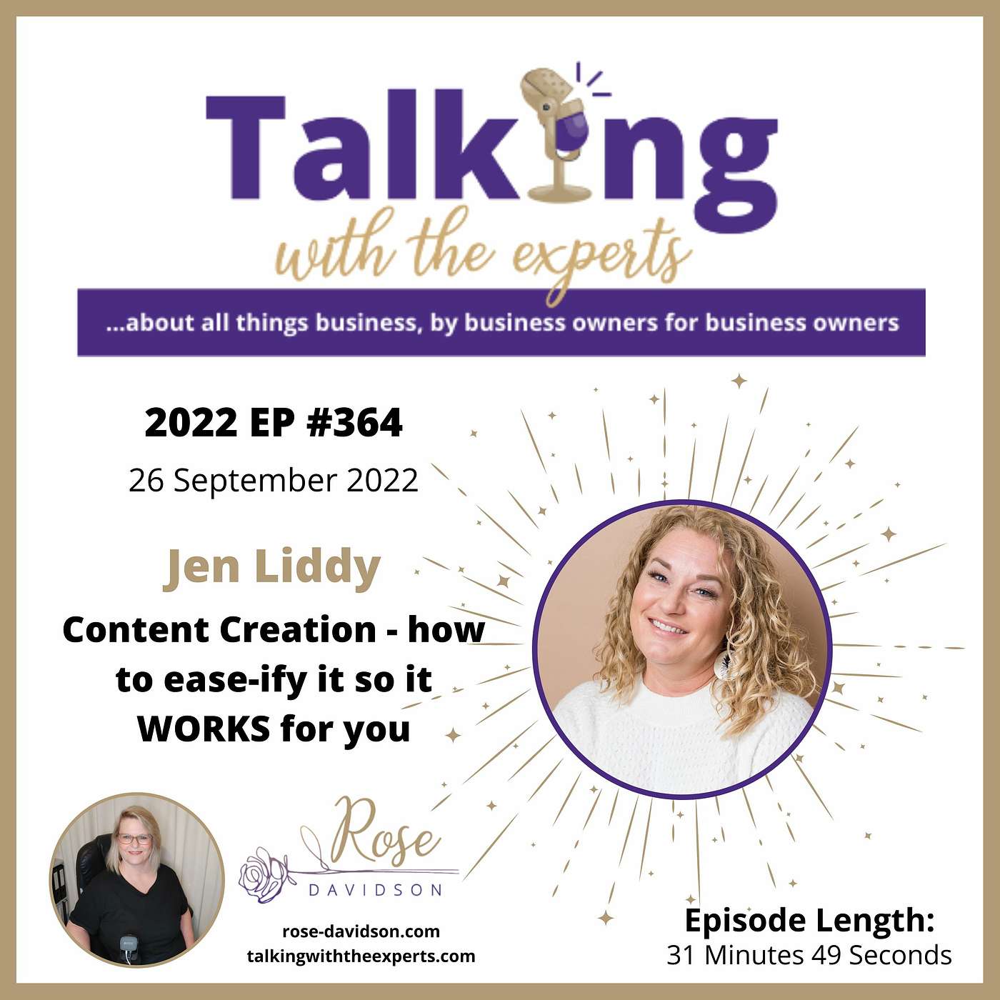 This podcast episode teaches how to make content creation easier for the solopreneur. It provides strategies for connecting with the audience and making the process more personalized.So many solopreneurs are completely overwhelmed by the churning need for constant content. But they don't know what to say, how, or even WHY they're doing it. It's a DREADmill they can't step off of.I'd love to share simple strategies to help people learn how to connect with their audience and stop making it hard/complicated - with easy shifts that are personalized & customizable based on their personality, strengths, and preferences. That way, they get more ROI from the time & effort they're putting into their marketing, connect with their audience, and see traction!Jen left her high school teaching career to avoid a life doomed by grading crappy 9th-grade Romeo & Juliet essays. In 2013, she made a terrifying leap into entrepreneurship & learned everything the hard way! Today, as a Content Creation Specialist, Jen helps personal brands step off the content creation DREADmill, become better writers, & get out of content chaos.Connect with Jen:https://www.facebook.com/jennifer.g.liddyhttps://www.jenliddy.cominstagram.com/jenliddycoachhttps://www.pinterest.com/jenliddy/βΌ βΌConnect with Rose Davidson:Website:https://rose-davidson.com/Buy me a Coffee:https://www.buymeacoffee.com/rosesdavidsonBecome a patron:https://www.patreon.com/talkingwiththeexperts Leave a Google review:https://g.page/r/CaXk7K3UlEhzEBI/review Leave a review on iTunes:https://podcasts.apple.com/au/podcast/talking-with-the-experts/id1549141963SUBSCRIBE to YouTube:https://www.youtube.com/channel/UCkM5n5QJhnNAmUiMzii73wQFOLLOW on SoundCloud:https://soundcloud.com/talking-with-the-experts#business #entrepreneur #learnpodcasting #podcastepisode #podcastguest #podcasting #podcastinterview #podcastplaylist #podcasts #podcastskills #podcastshow #rosedavidson #smallbusiness #talkingwiththeexperts #video #vodcast