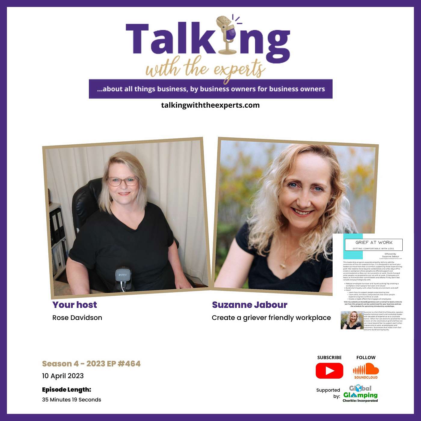 Grievers are at our businesses, both in our staff and our clients. Most business owners don't know how to support them or create a griever-friendly workplace. We build relationships and loyalty when we have the skills and mindsets to support them.Suzanne is a grieving mom who has found meaning in her loss throughhelping grievers and those who are supporting them. She now helps other grievers chart their unique grief path. She also works to help people, organizations, and businesses build the skills and protocols to support grieving people better and normalize grief as an expected and healthy part of our lives. She is a transformational coach and workshop leader, and certified Grief Educator.Connect with Suzanne:https://ALivedExperience.comhttp://Facebook.com/A-Lived-Experience-104025818352767,http://instagram.com/a.lived.experiencePROMOTION:GAW 1pg.png▼ ▼You can connect with/follow Talking with the Experts: Website:https://talkingwiththeexperts.com/LinkedIn:Rose Davidson: https://www.linkedin.com/in/rose-davidson/ Talking with the Experts: https://www.linkedin.com/company/talkingwiththeexperts/Facebook Page: [Rose Davidson]https://www.facebook.com/rosedavidsonaustralia/Instagram:https://www.instagram.com/rosedavidson_australia/SoundCloud: [Follow]https://soundcloud.com/talking-with-the-expertsYouTube: [Subscribe]https://www.youtube.com/channel/UCkM5n5QJhnNAmUiMzii73wQ#business #entrepreneur #marketing #businessstrategy #entrepreneurship #leadership #finance #startups #strategy #productivity