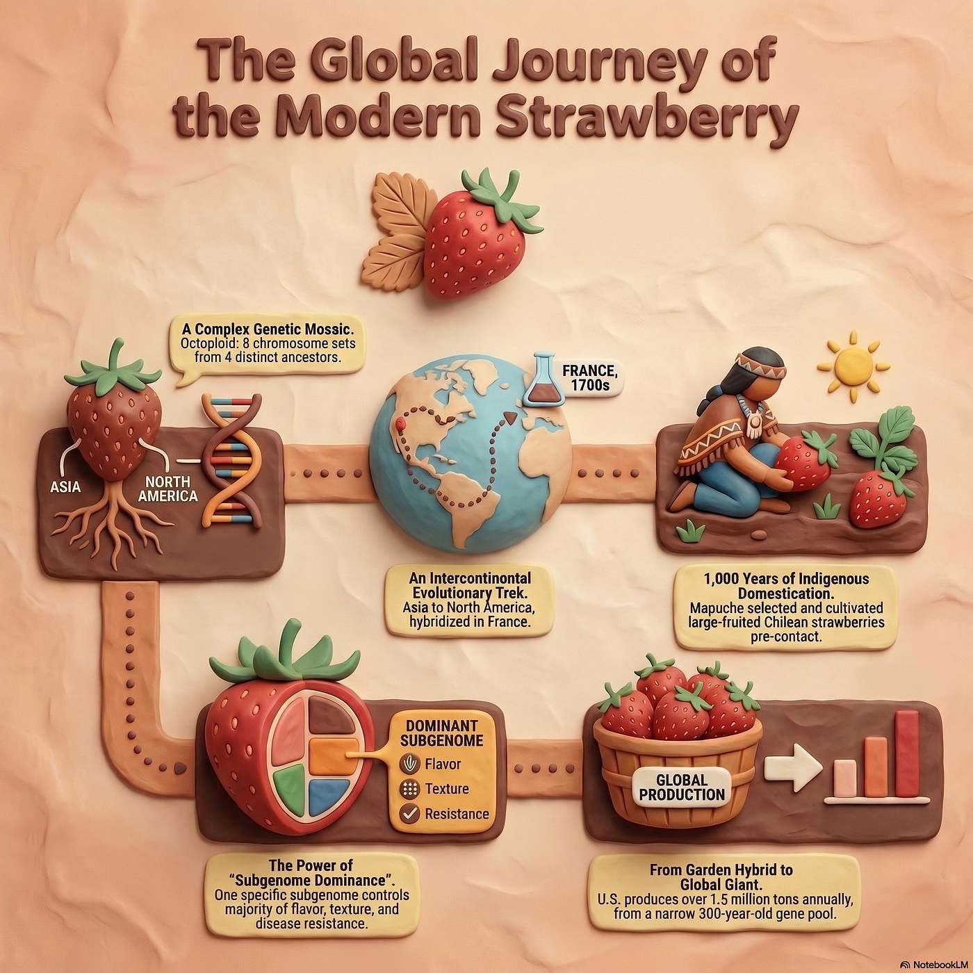 We trace the remarkably optimistic, multi-continent story behind the modern strawberry: indigenous Mapuche cultivation of the wild Chilean strawberry for a thousand years, a chance 18th‑century Brittany cross with the Virginia strawberry, and the genome era that revealed an octoploid fruit built from four ancestral subgenomes. From sifting through 170 billion nucleotides into an 830‑million‑base-pair reference genome to genome-informed breeding and multi-omics for sweeter, firmer fruit, this episode explains how your crunchy-water strawberry came to be—and what future flavors may lie ahead.
