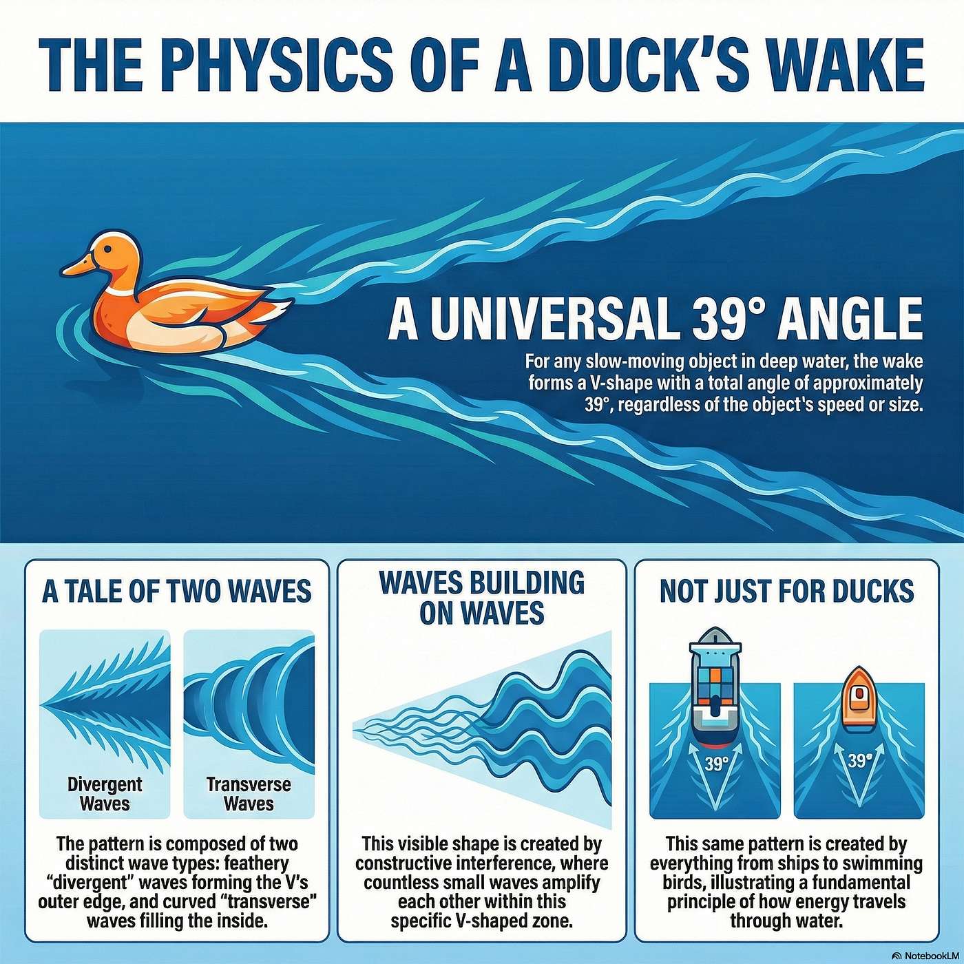 Take a walk by a pond and watch physics unfold: Kelvin’s wake pattern forms a universal 39-degree V behind a moving body in deep water. We explore why the angle is independent of size or speed, how interference selects the visible wake, and the two-to-one ratio between phase and group velocity that confines the wedge. Inside the V you’ll spot transverse waves and divergent wavelets, and we’ll discuss how a duck perceives the waves as stationary shockwaves—turning a simple pond into a precise, eye-catching demonstration of physics.