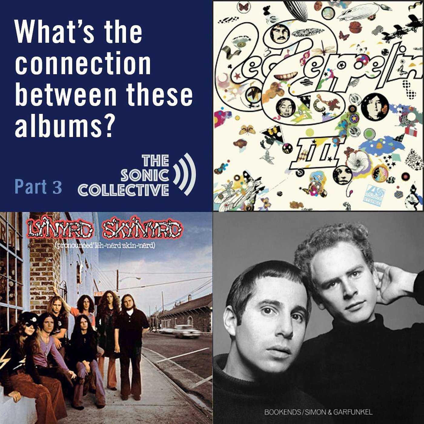 Hey all you collectivists out there. This is Scott G from the Sonic Collective. How's it going? We're on round three of our game of "What's the connection between these albums?" I hope you've been enjoying it as much as we have. I've really enjoyed teasing out what the common threads are between the albums Darren and Scott C picked. Hearing what everyone thought were the direct links along with their more nuanced takes.So I've picked three albums that also have some very explicit connections I'm hoping everyone finds along with the different subleties we'll each key on and share.This month's albums are, in no particular order:Led Zeppelin, Led Zeppelin III,Simon and Garfunkle, Bookends, andLynyrd Skynyrd, Pronounced 'Lĕh-'nérd 'Skin-'nérd.Now I know what you're thinking, "Hey these albums are practically identical, how are we supposed to pick just a couple similarities???" But I have faith you all will listen along, jot down some notes and join us at the end of the month to hear what the crew teased out too. Until then, this is Scott G from the Sonic Collective signing off.