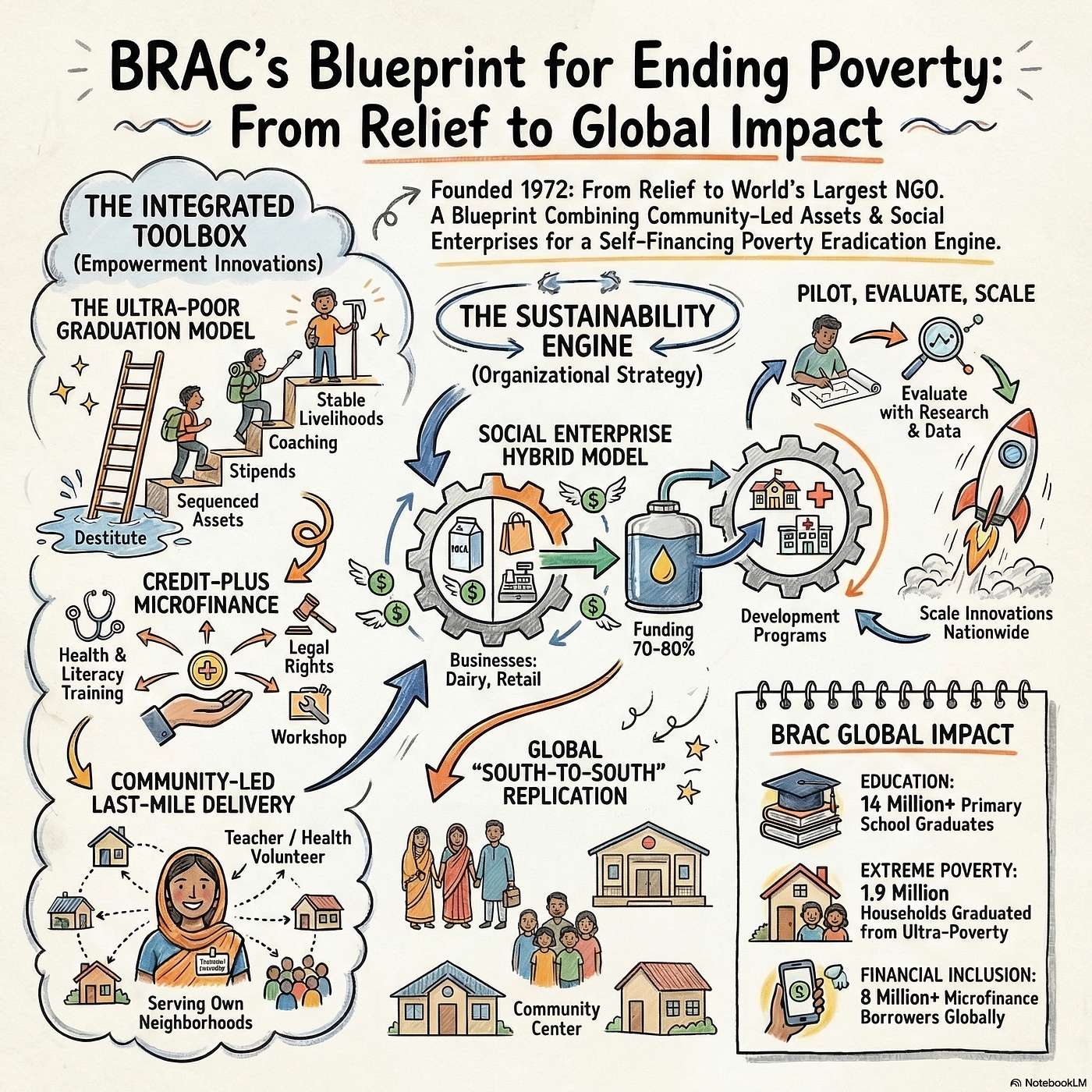 We trace BRAC’s evolution across five decades—from door-to-door oral rehydration campaigns and village schools for girls, to pioneering ultra-poor graduation and global replication in Africa and Asia. Along the way, BRAC has empowered tens of millions of women, educated over 14 million children, and lifted millions out of extreme poverty—without losing sight of dignity, equity, and learning. This is the story of how development can be built from the bottom up—and scaled for lasting change.