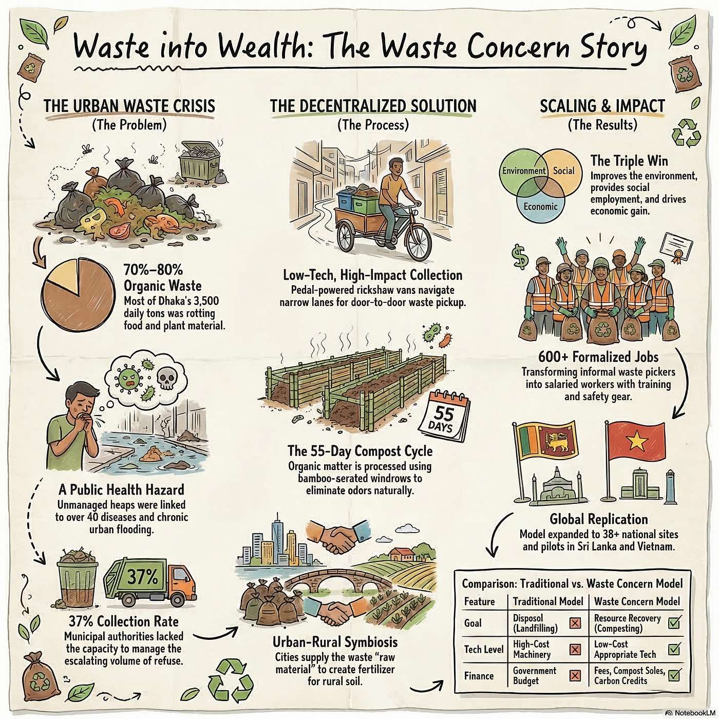 We explore how Waste Concern went from one community pilot to dozens of sites across Bangladesh, catalyzing a national composting movement and influencing government waste policy. The organization built a scalable system by combining low-cost technology, micro-enterprise job creation, and strong community participation. Along the way, it pioneered a hybrid NGO-consulting model and leveraged international partnerships—including carbon finance mechanisms and public-private collaborations—to fund large-scale infrastructure like Dhaka’s 700-ton composting facility. The model has since been replicated in Sri Lanka, Vietnam, and beyond, demonstrating how smart, inclusive design can solve deeply rooted environmental and public health challenges.