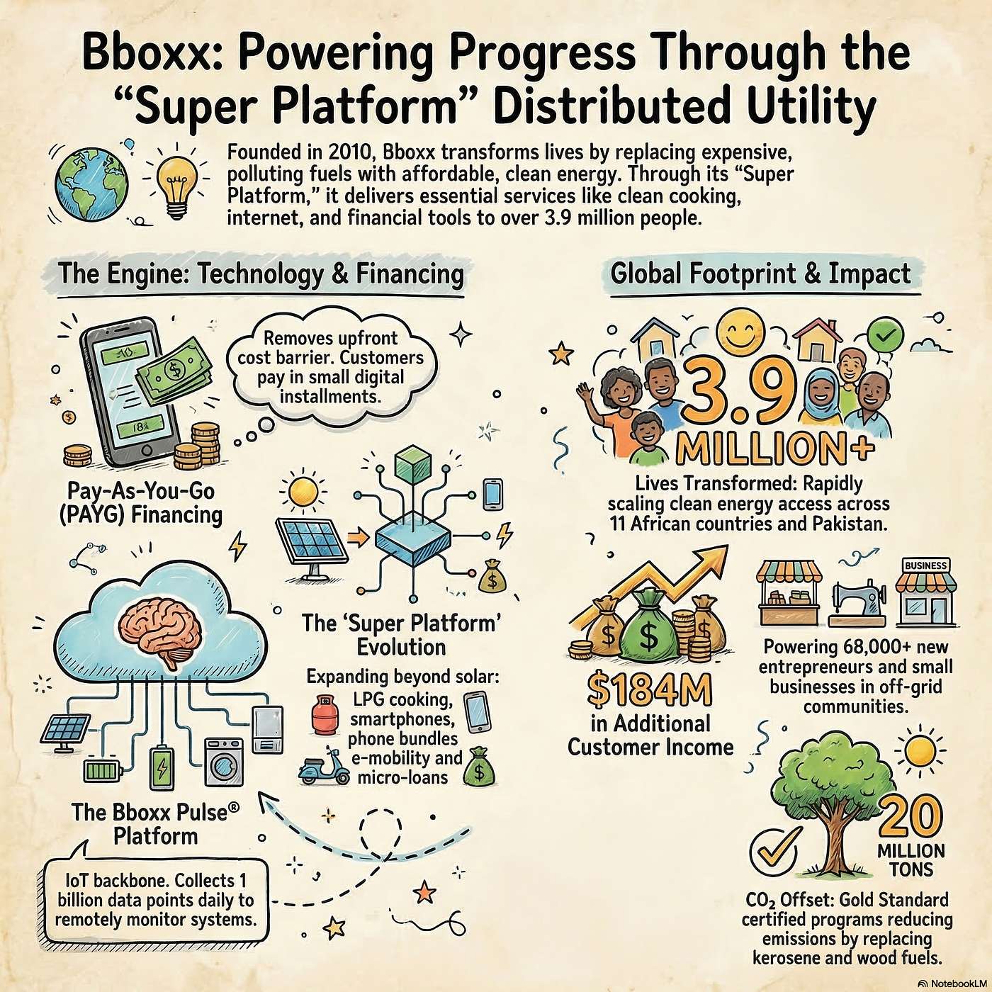 This episode examines the evolution of Bboxx, a technology-driven enterprise dedicated to alleviating energy poverty in Sub-Saharan Africa and Pakistan. By leveraging solar home systems and an innovative pay-as-you-go (PAYG) financing model, the company provides affordable electricity to underserved populations living outside traditional power grids. Central to its operations is Bboxx Pulse®, a digital platform that utilizes IoT data to monitor systems remotely and manage customer payments effectively. Over time, the firm has transitioned into a "super platform" by diversifying its offerings to include clean cooking solutions, smartphones, and financial services. The sources highlight how this partnership-oriented business model drives progress toward several Sustainable Development Goals, including climate action and economic empowerment. Ultimately, the documentation illustrates the transformative impact of decentralized renewable energy on health, education, and quality of life for millions of people.