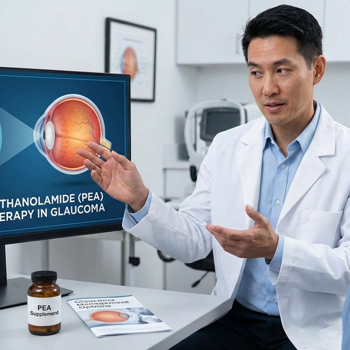 Palmitoylethanolamide (PEA) in Glaucoma: A Review of Clinical EvidenceGlaucoma is an eye disease marked by optic nerve damage, often linked to high intraocular pressure (IOP). Standard glaucoma treatments focus on lowering IOP, but researchers are exploring neuroprotective supplements as add-ons. One promising compound is palmitoylethanolamide (PEA), a naturally occurring fatty acid amide with anti-inflammatory and neuroprotective effects (). PEA is found in foods (egg, soy, peanuts) and made in our bodies; it interacts with the endocannabinoid system and PPAR-α receptors to calm nerve inflammation. In Italy and parts of Europe, PEA is even sold as a medical food (e.g. “PeaPure,” Normast) for eye health (). Importantly, a recent analysis found that PEA treatment significantly lowers IOP in glaucoma and ocular hypertension patients (). In practice, PEA is usually given orally (often 600 mg per day in divided doses) alongside regular eye drops. This article reviews human trials of PEA in glaucoma, focusing on IOP reduction, nerve protection, dosing, and safety.PEA and Intraocular PressureSeveral clinical trials have tested whether oral PEA can help lower IOP in glaucoma or ocular hypertension. In these studies, patients usually continued their usual eye drops and added PEA tablets. A key finding is that PEA tends to produce a modest but statistically significant drop in IOP compared to control. For example, one randomized crossover trial added PEA (300 mg twice daily) to glaucoma therapy (timolol drops) in patients with open-angle glaucoma or ocular hypertension (). After two months on PEA, mean IOP fell by about 3.5 mmHg (15%) from baseline, versus only ~0.3 mmHg with placebo (). No changes in vision or side effects were seen. In practical terms, that 3.5 mmHg drop can be meaningful toward preventing nerve damage. Another well-designed study looked at ocular hypertensive patients (IOP above normal but no optic nerve damage) in a placebo-controlled crossover design (). Participants took 300 mg PEA twice a day for 3 months (with a 2-month washout then switch). The PEA period showed significantly lower IOP (around 22.2 mmHg) compared to placebo (23.0 mmHg) () – a reduction of about 0.8 mmHg. More strikingly, vascular function (flow-mediated dilation of the brachial artery) improved significantly on PEA and stayed better even after stopping PEA (). This suggests PEA not only lowers eye pressure slightly, but also boosts blood vessel health, which may benefit glaucoma.A meta-analysis of these trials confirms PEA’s pressure effect. Daily PEA intake (typically 600 mg total) was associated with about a 1.3 mmHg greater IOP reduction than placebo on average (). In plain terms, patients on PEA consistently saw small, statistically significant drops in IOP beyond what standard drops achieved () (). Even if 1–3 mmHg sounds minor, every bit helps protect glaucoma nerves. For example, one review concluded: “PEA showed significant efficacy in reducing IOP in patients…encouraging its clinical use in glaucoma” ().Some trials focused on specific situations. After laser iridotomy (a YAG laser opening in the iris, which can cause a temporary pressure spike), patients were pretreated with PEA or placebo for 2 weeks (2 tablets/day). The PEA group did not experience the usual IOP jump seen in the placebo group (). In other words, PEA “counteracted” the post-laser pressure rise, likely by reducing inflammation in the eye ().In summary, PEA taken orally (usually 300 mg twice daily, or 600 mg total) for weeks to months