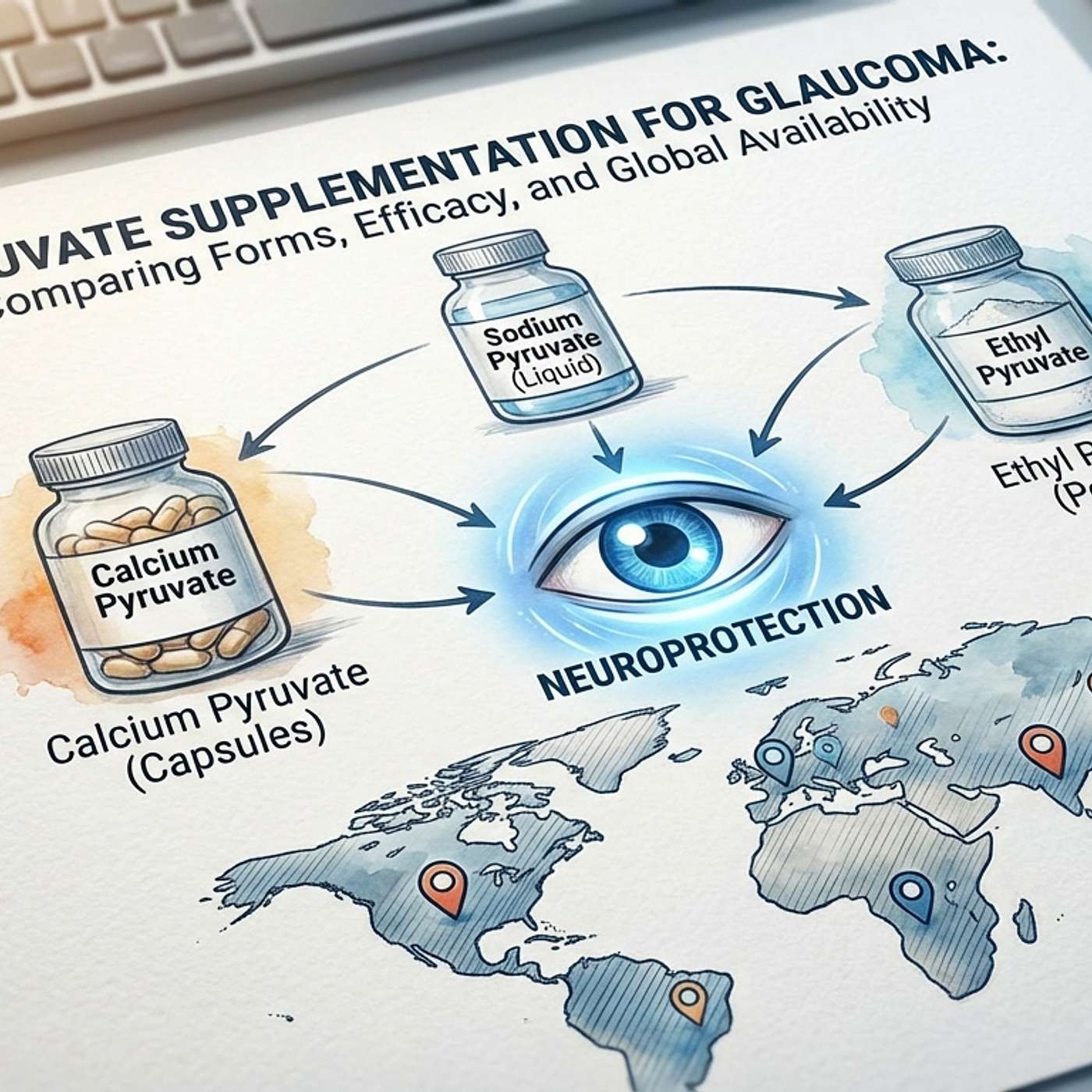 Pyruvate Supplementation for Glaucoma: Comparing Forms, Efficacy, and Global AvailabilityGlaucoma is a common eye disease that damages the optic nerve and leads to vision loss by killing off special retinal nerve cells called retinal ganglion cells. It is actually the leading cause of irreversible blindness worldwide (). Normally, these eye nerves need a lot of energy to function. Recent research suggests that pyruvate – a natural energy molecule in our cells – might help protect the retina. In simple terms, pyruvate can act like a “fuel” for the nerves in your eye and also helps keep the tiny power plants inside those nerves (called mitochondria) running smoothly. This article explains how pyruvate helps the eye’s cells, what studies say about glaucoma, the added health perks of pyruvate, and how different pyruvate supplements compare (calcium pyruvate, creatine pyruvate, sodium pyruvate). We also look at how easy it is to find these supplements around the world.How Pyruvate Fuels Eye CellsPyruvate is a three-carbon compound our bodies make when sugars are broken down for energy (). Think of it as a key fuel molecule: it can enter cells and head straight to the mitochondria (the cell’s “powerhouse” organelles) to be turned into usable energy (ATP). In mitochondria, pyruvate is converted into chemicals that keep the energy cycle (Krebs cycle) going. This process also helps regenerate a helper molecule called nicotinamide adenine dinucleotide (NAD⁺), which is crucial for energy production.For retinal ganglion cells (the nerves that carry images from the eye to the brain), healthy mitochondria mean survival and good vision. In glaucoma, rising eye pressure and other stresses disrupt metabolism: studies in mice have shown that eye pressure causes retinal mitochondria to falter and pyruvate levels in the retina actually drop as the disease starts (). When the cells lose pyruvate, their energy production stalls and they become vulnerable. Importantly, pyruvate does more than just fuel cells. It has antioxidant and anti-inflammatory effects in cells. Lab research notes that pyruvate can neutralize harmful byproducts (free radicals) and lower stress in cells (). In other words, pyruvate not only powers up the cell but also helps protect it from damage (for example by reducing oxidative stress). This dual role – fueling mitochondria and guarding against cell stress – is why scientists are excited about its neuroprotective potential in glaucoma.Pyruvate’s Neuroprotective Effects in GlaucomaMultiple studies have now tested pyruvate in glaucoma models. In a landmark study, researchers induced glaucoma in rats and mice and monitored eye health (). They saw two key things: first, that glaucoma caused a drop in retinal pyruvate and a backup of sugar metabolism in the eye (). Second, and most importantly, when they gave the animals extra pyruvate by mouth every day, the retinal ganglion cells were much healthier. In those animals, optic nerve damage and cell loss were dramatically reduced compared to controls (). In plain language, the pyruvate supplement acted like a rescue: it restored fuel levels in the retina and the nerve cells survived the glaucoma attack ().Even more encouraging are recent findings