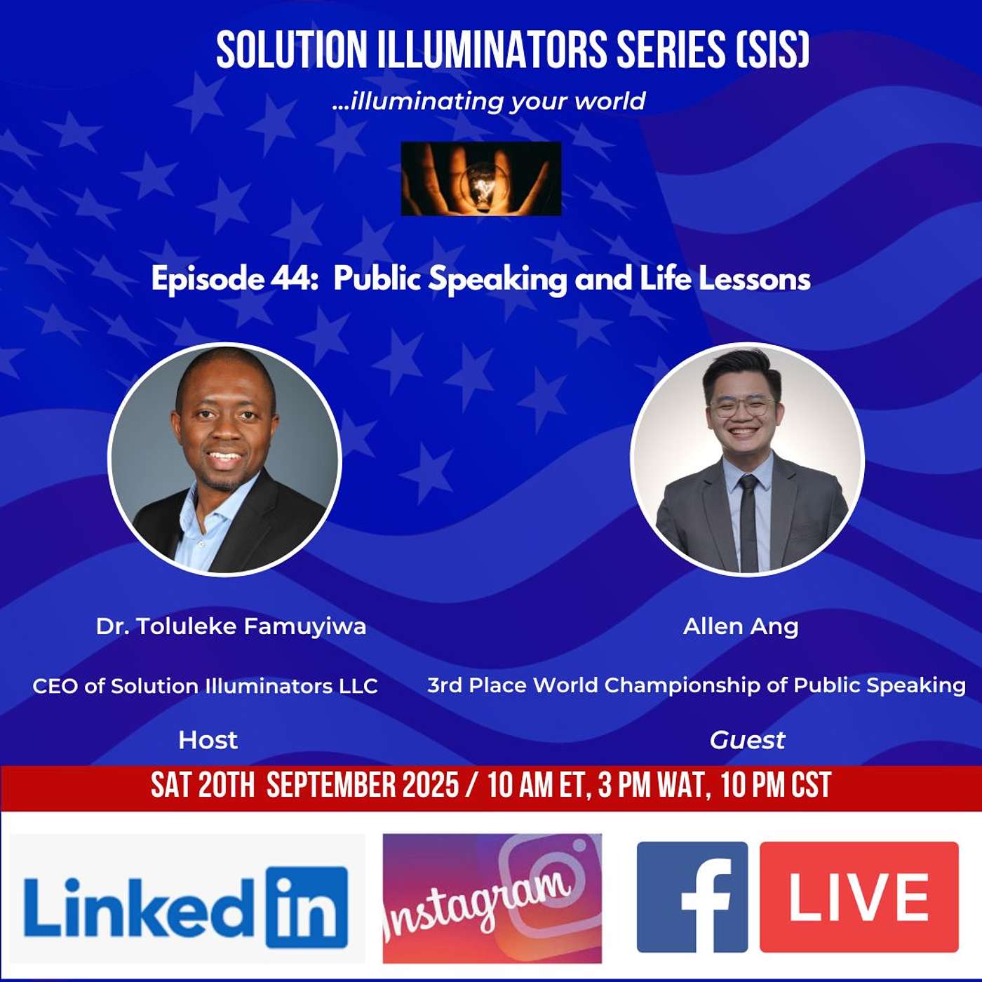 Solution Illuminators Series (SIS) Podcast Episode 44 on Public Speaking and Life Lessons. As the guest, Allen Ang, 3rd place winner, presented on feedback, accent, humor, culture, contest Trevor Noah, Kevin Hart, Russel Peters, and Gabriel Iglesias. Allen Ang, 3rd place winner of the 2025 World Championship of Public Speaking, spoke on feedback, accent, humor, and many other topics.