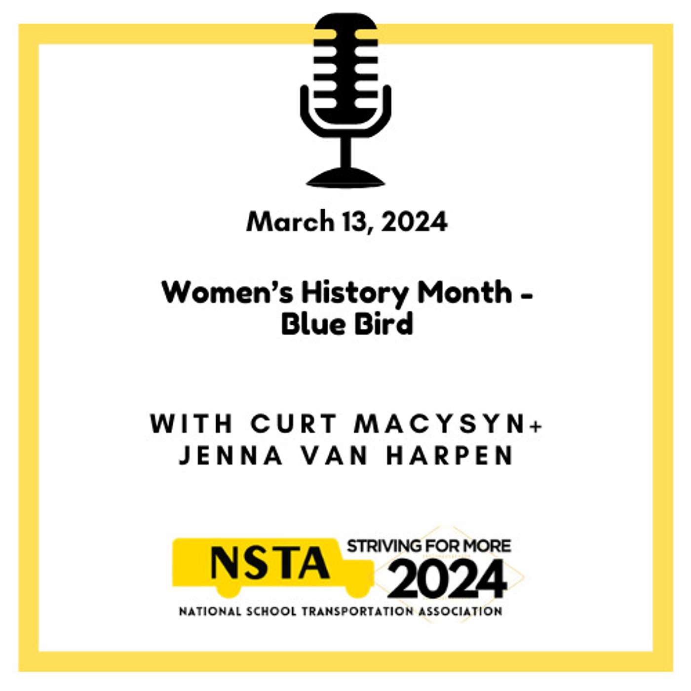 This week at NSTA: The Bus Stop - NSTA Executive Director Curt Macysyn continues the celebration of Women's History Month by interviewing Jenna Van Harpen, Executive Director, Blue Bird. Jenna outlines her background in the industry and what led her back to school transportation after a time in the transit industry. Jenna highlights a woman that impacted her early in her career in school transportation. Lastly, Jenna discusses the importance of women in the industry. Become a subscriber and listen to a new episode every week - reasonable advertising packages are available too!