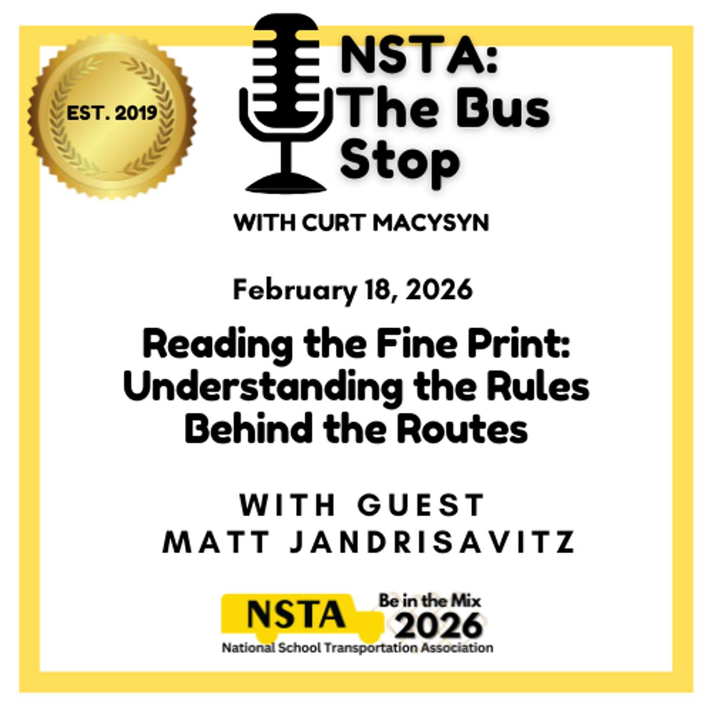 This week at NSTA: The Bus Stop-Executive Director Curt Macysyn welcomes returning guest Matt Jandrisavitz, Partner at RC Kelly Law Associates and counsel to the National School Transportation Association. Matt shares his professional background and reflects on the 2026 NSTA Midwinter Meeting in Fort Lauderdale, including highlights from his legal session, “Covering Your Bases: Safeguarding Special Needs Transportation for Contractors,” and offers practical insight into the legal and risk-management considerations facing school bus operators. The conversation also turns to federal advocacy as NSTA prepares for its annual Bus-In, where Curt and Matt discuss engaging lawmakers on Capitol Hill and the strategic importance of the Under the Hood Exemption for long-term industry stability. He also previews the upcoming MST Committee flash webinar, “Getting Paid: Handling Invoicing & Procurement with School Districts,” explaining why payment processes and procurement compliance are especially relevant today. The duo close the episode with a lighter discussion about joining the NSTA Run Club and where listeners can learn more about RC Kelly Law Associates. Become a podcast subscriber and don't miss an episode of NSTA: The Bus Stop - NSTA Vendor Partners should reach out to us to take advantage of our comprehensive advertising package that reaches your target audience - student transportation professionals!