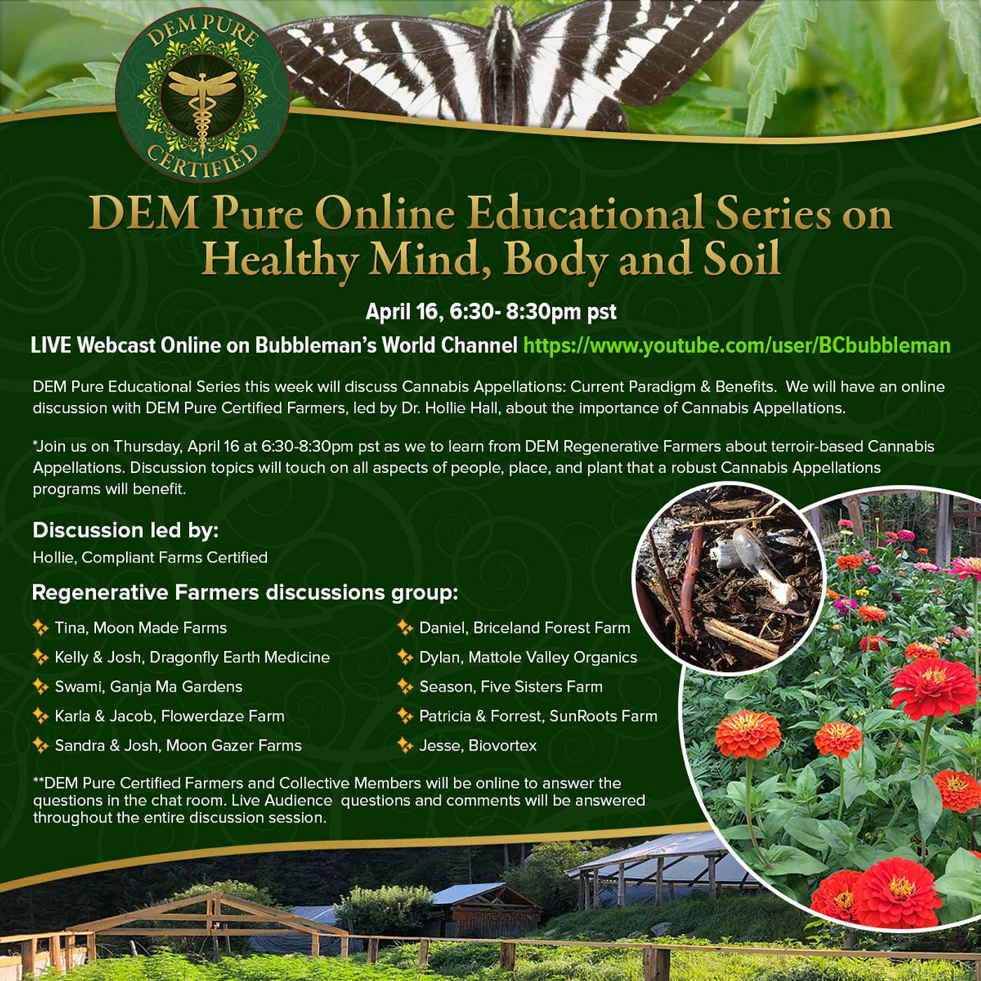DEM Pure Educational Series this week will discuss Cannabis Appellations: Current Paradigm & Benefits. We will have an online discussion with DEM Pure Certified Farmers, led by Dr. Hollie Hall, about the importance of Cannabis Appellations.