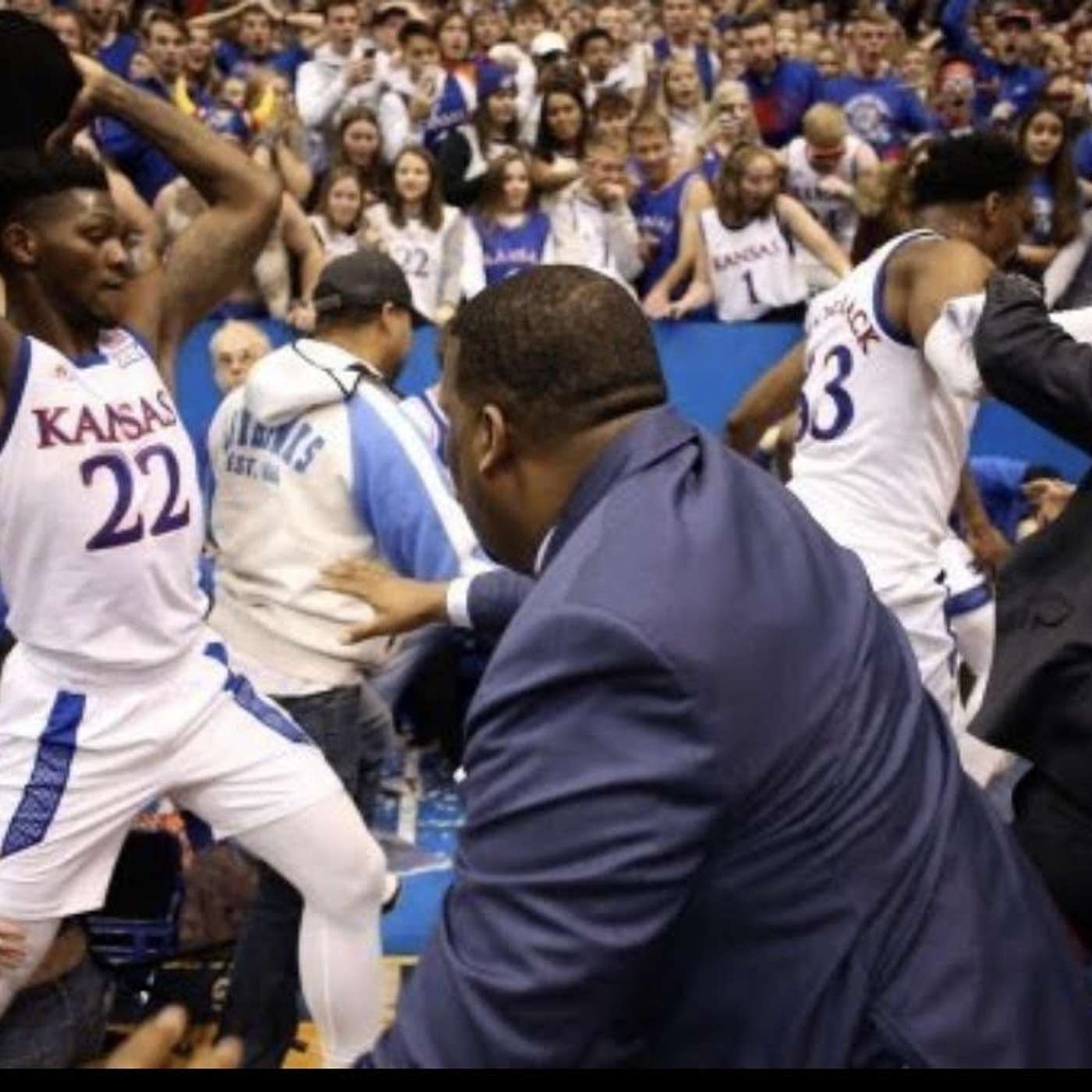 Must have been something in the water last night. In Kansas, 6'9-245 pound Kansas forward Silvio De Sousa decided to taunt a Kansas State player at the end of the game and started a donnybrook that led to him picking up a stool to do bodily harm to someone. Thankfully for him an assistant coach grabbed it from him.