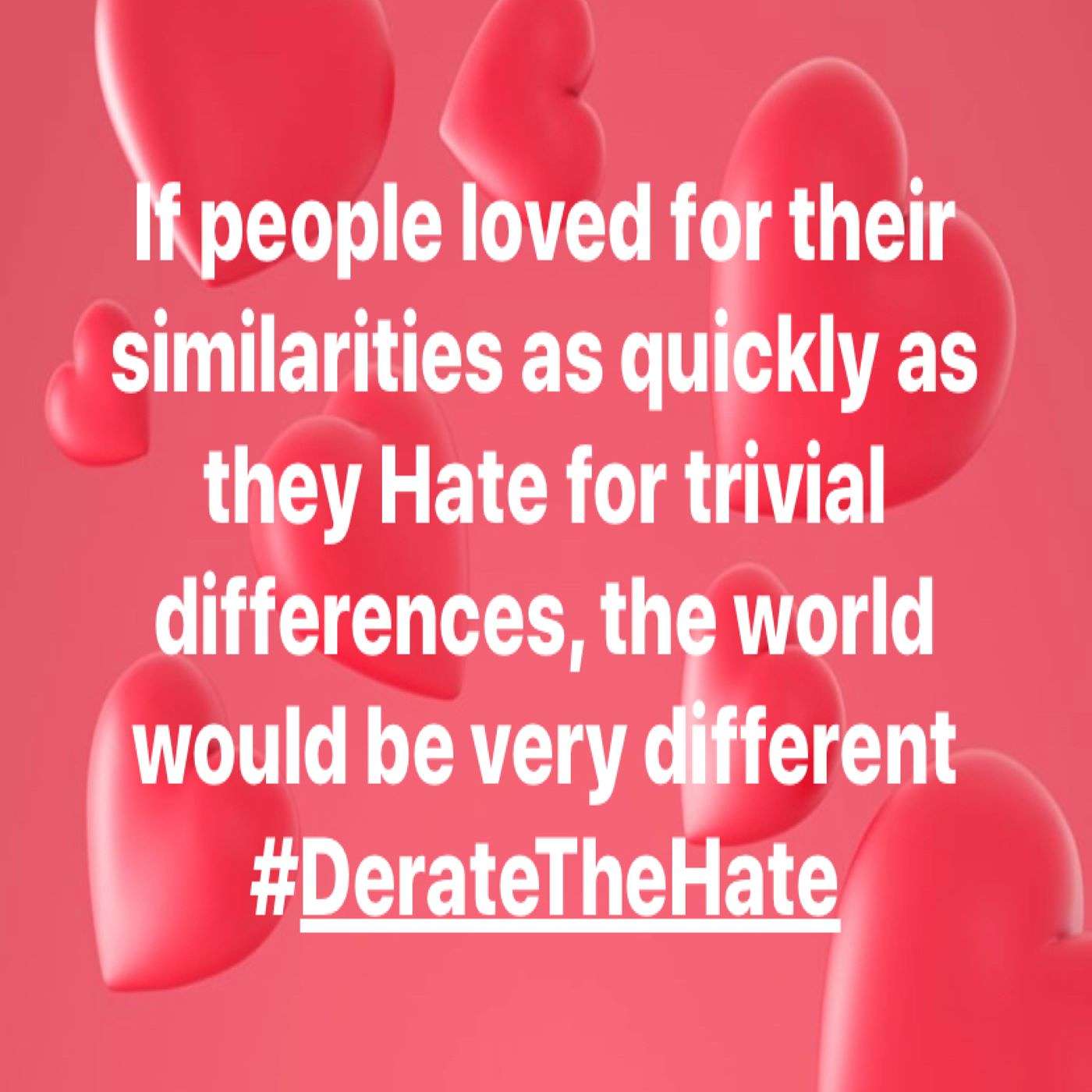 As I've talked about time and time again in the #DerateTheHate podcast, we as individuals must not allow the worst around us be the biggest influences on us. With each episode, I truly intend to better the world one attitude at a time, and if any of our episodes reach and influence just one person to better their attitude in some way, it's a truly beautiful thing. With that said, I'll ask it again and hopefully you think about it and act upon it, what if people loved one another for their similarities as quickly as some hate for their trivial differences? Is there something you can do today to change that? I bet there is...