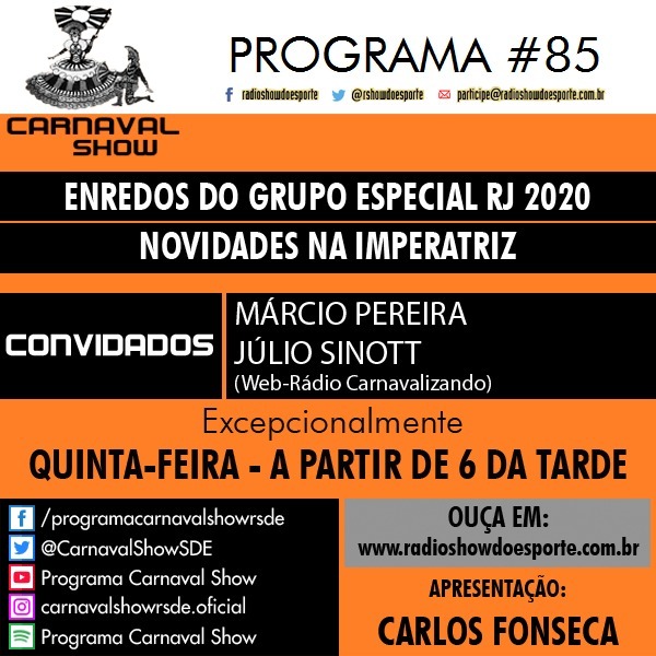 CARNAVAL SHOW, o programa que é puro samba no pé! Toda quarta-feira, a partir de 8 da noite, na Rádio Show do Esporte, a Mais Jovem do Brasil! Reprise todas quinta-feira, a partir de 6 da tarde. Samba, informação e debate na apresentação de Carlos Fonseca. OUÇA O PROGRAMA ATRAVÉS DO SITE radioshowdoesporte.com.br ou pelas plataformas RadiosNet, Portal Rádios, Strema e Online Radio Box (pesquise por Rádio Show do Esporte em ambos). Parceria oficial do site Sambario.