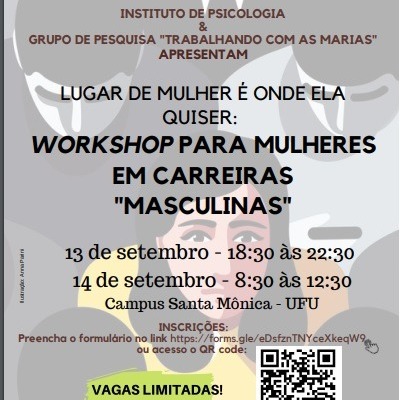 Workshop para mulheres em carreiras masculinas. Será nos dias 13 e 14 de setembro, no campus Santa Mônica. A promoção é do Instituto de Psicologia da UFU e Grupo de pesquisa "Trabalhando com as Marias".