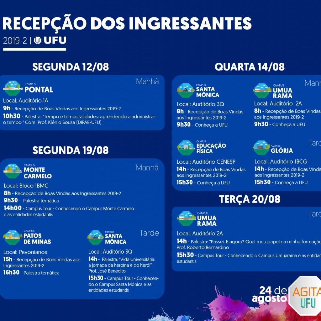 Início de semestre. Para receber os novos estudantes, a UFU preparou diversas atividades que vão até 24 de agosto.