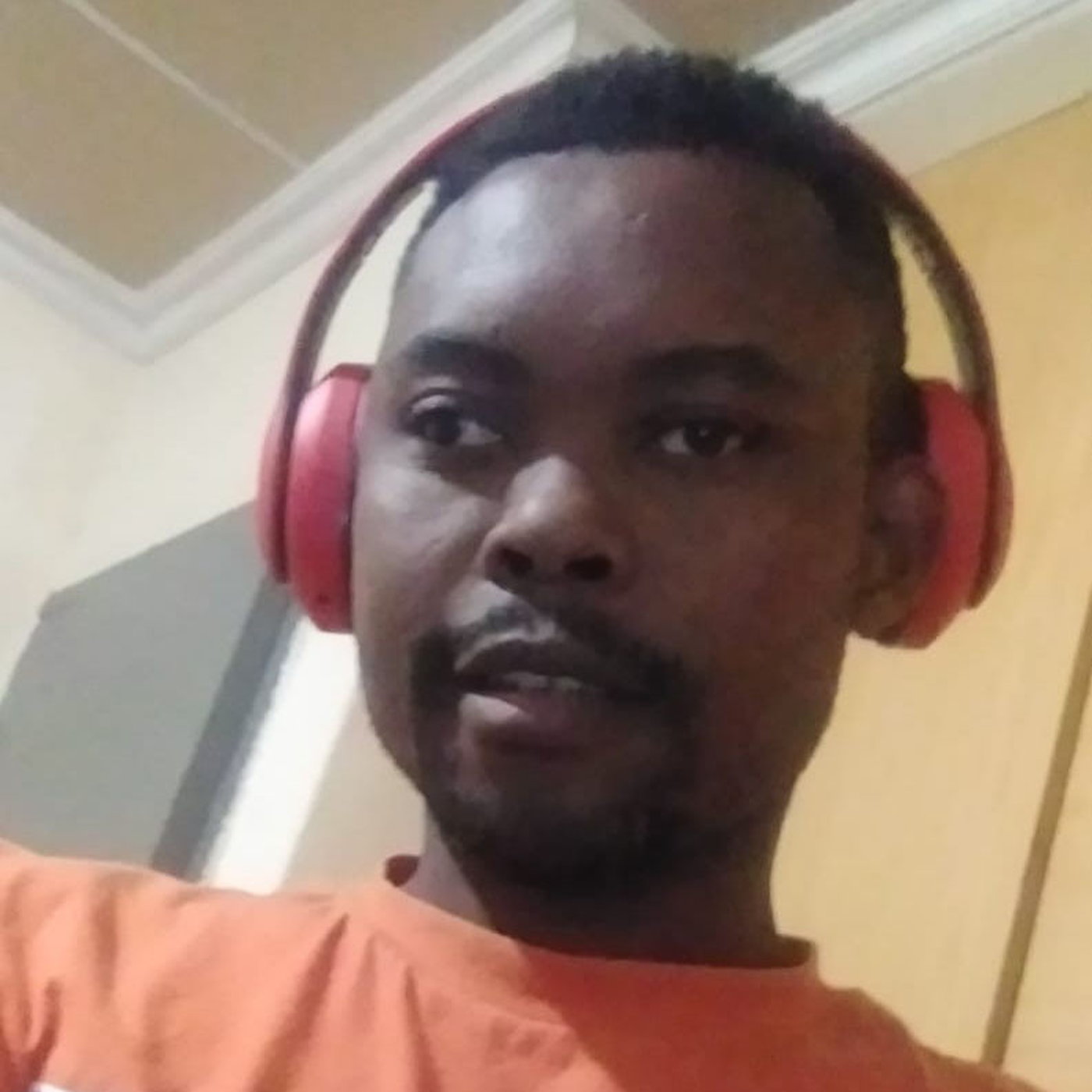 A man with short black hair wearing red over-ear headphones. He has a mustache and a short beard. He is wearing an orange shirt with white and blue lettering that is partially visible.