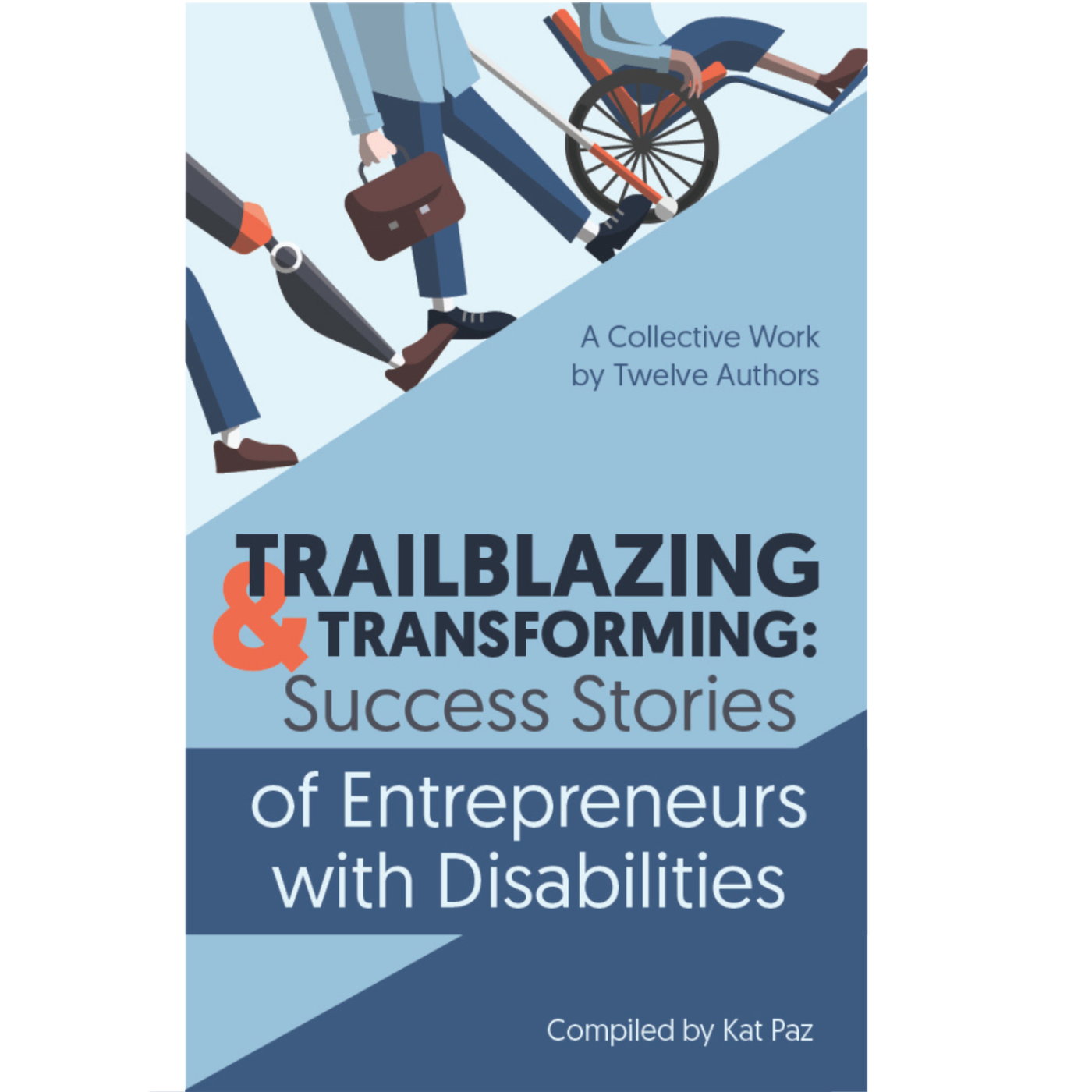 Cover of the book Trailblazing and Transforming, Success Stories of Entrepreneurs with Disabilities, compiled by Kat Paz. The cover is in shades of blue and gray with pops of orange. It features three graphics of people from the waist down. On the left is a person with a prosthetic leg. In the middle is a person wearing business attire with a briefcase in their left hand and a white cane in their right hand. The right image is of a person in a wheelchair.