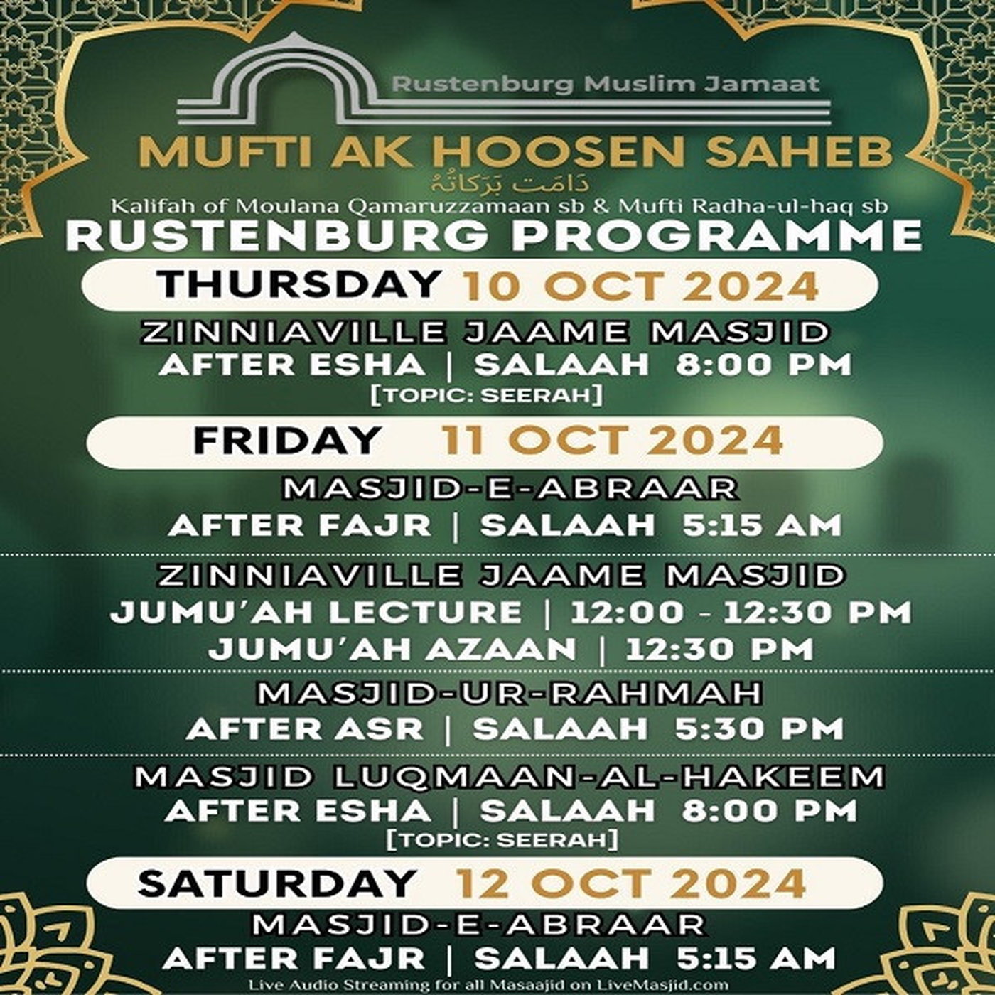 11 Ocotber 2024 - Mufti AK Hoosen Saheb Rustenburg Progrtamme