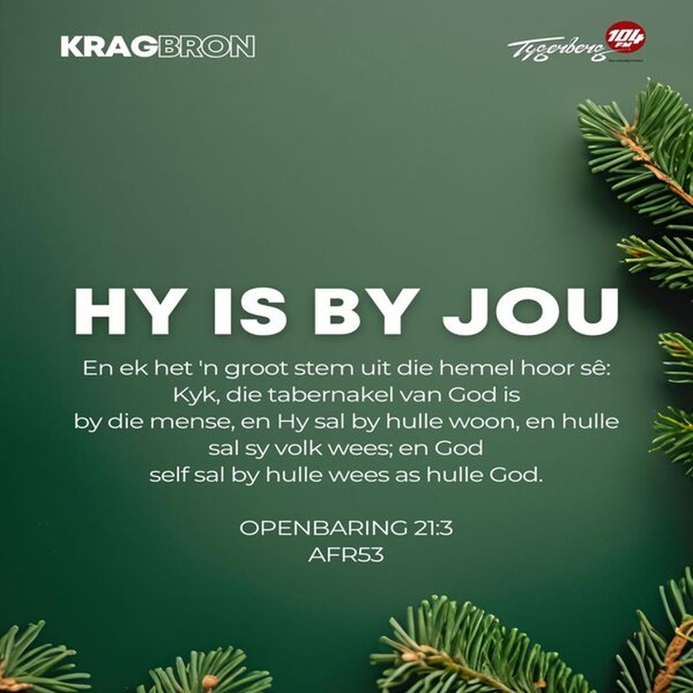 En ek het 'n groot stem uit die hemel hoor sĂȘ: Kyk, die tabernakel van God is by die mense, en Hy sal by hulle woon, en hulle sal sy volk wees; en God self sal by hulle wees as hulle God. OPENBARING 21:3 AFR53